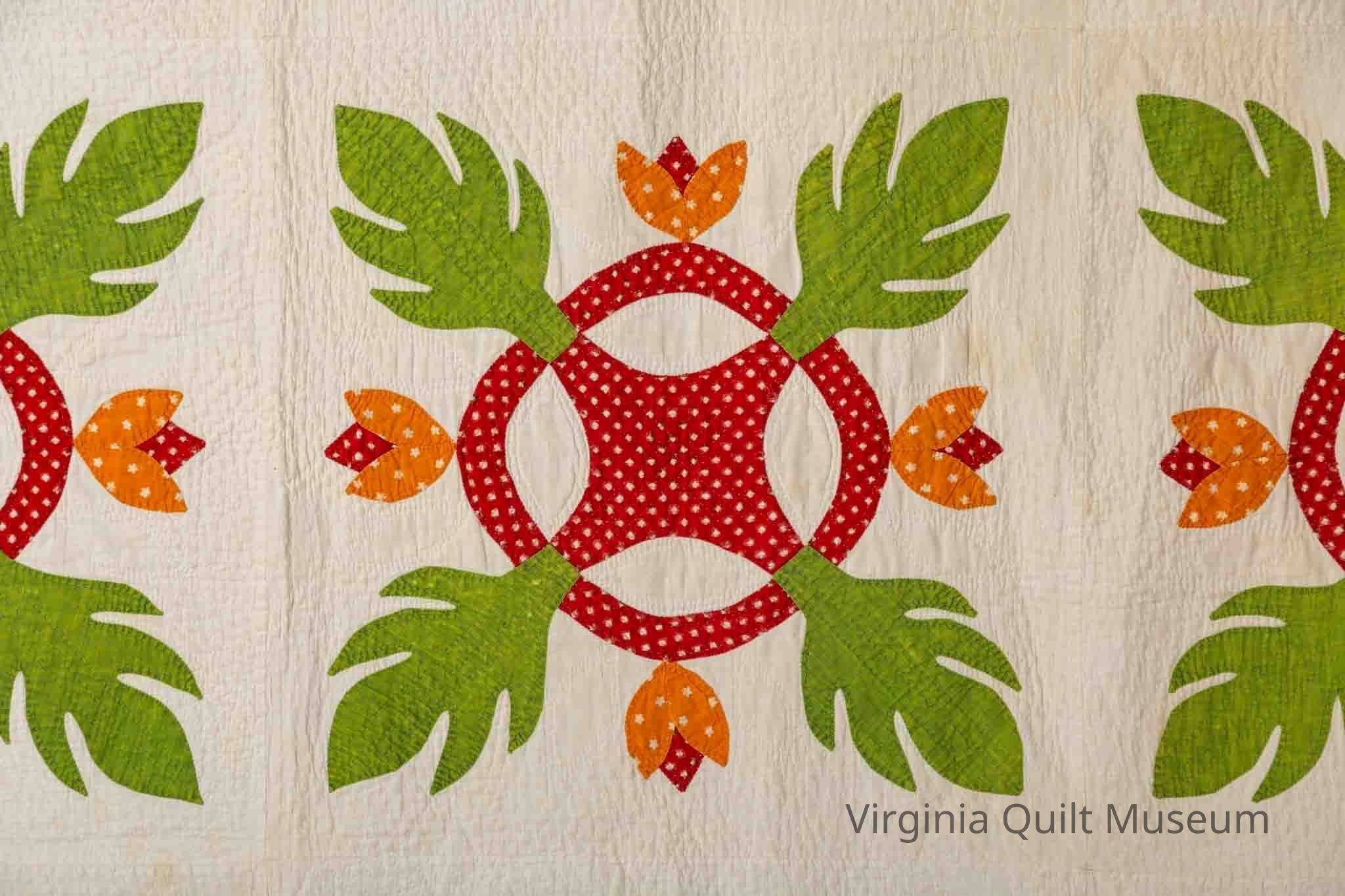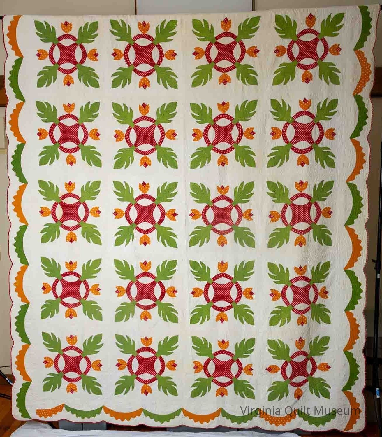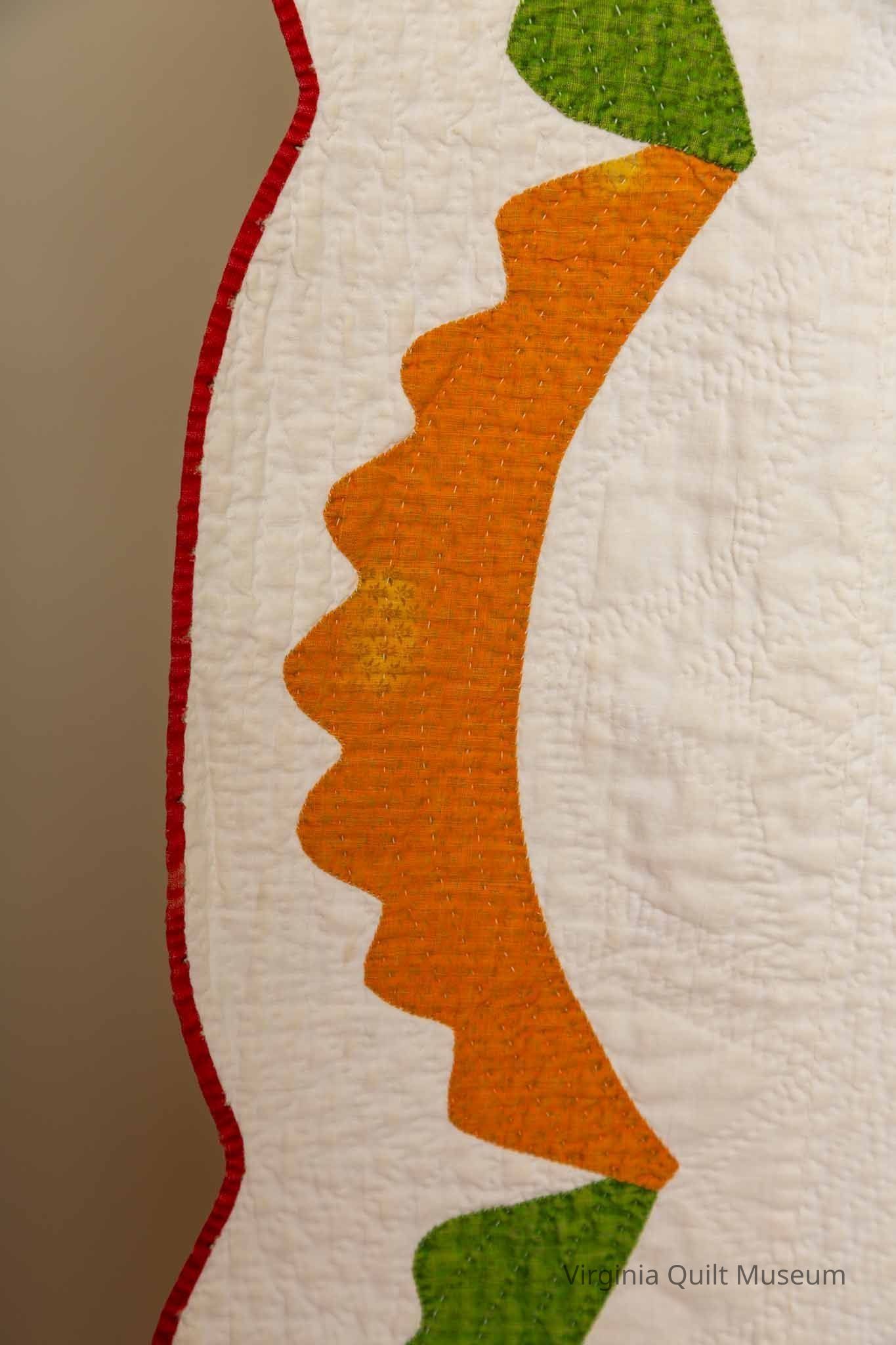 A single border surrounds the quilt on 3 sides, featuring a cheddar and green swag using the same fabric as the quilt. The edge and binding is scalloped with rounded edges.