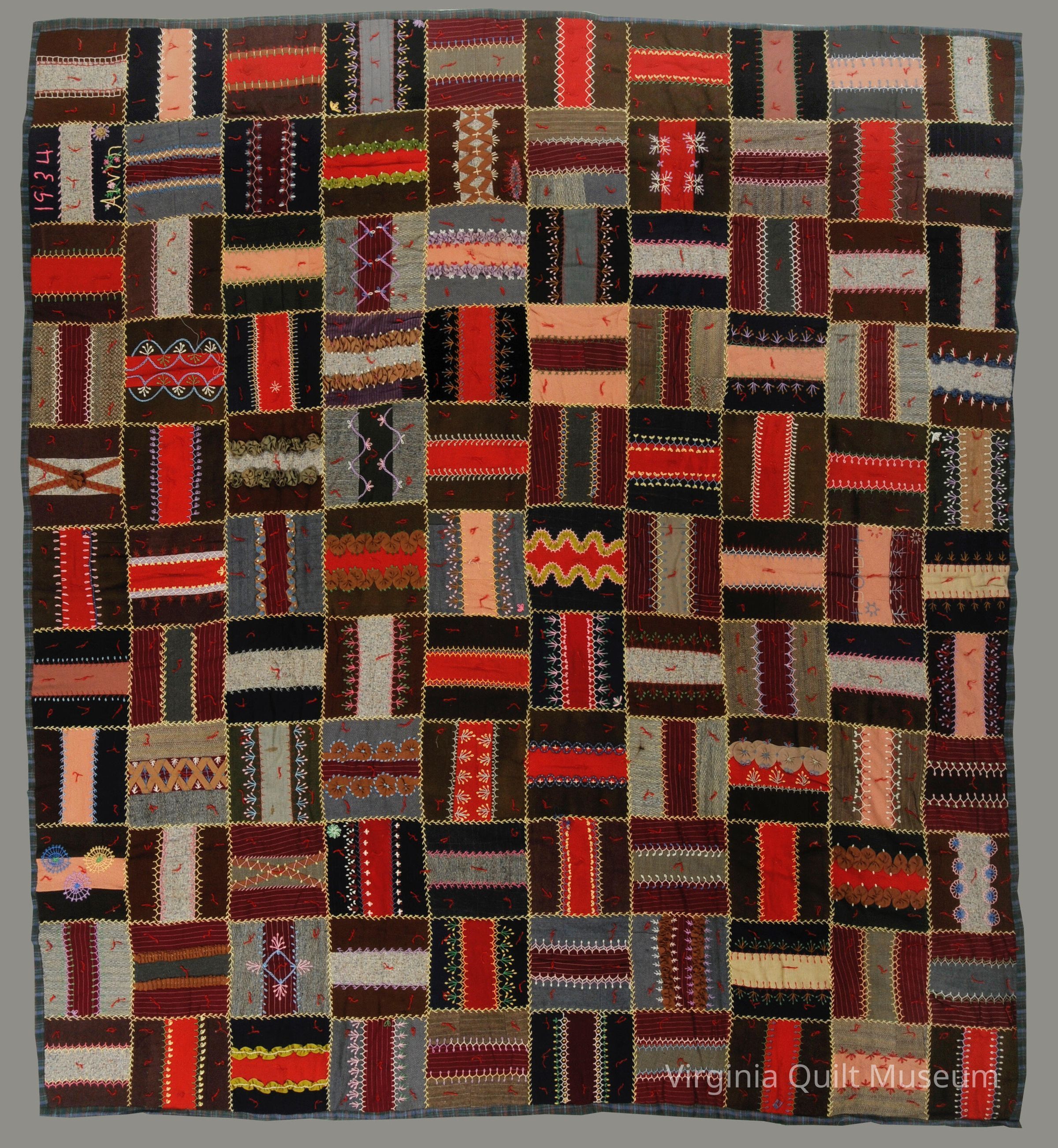 This Rain Fence Crazy Quilt is made with wool at a size of 77" x 88 1/2". It consists of 110 rail fence blocks measuring 7 1/2" square. Colors used are red, brown, burgundy, peach, black, and purple. The quilt is machine pieced and tied with red embroidery floss. Decorative treatment is achieved in the embellishments used. They include embroidery in a variety of stitches covering the seams, as well as the date, 1934, and the name, Alvin, the recipient of the quilt, and the creative use of woven twill tape. The tape has been braided, gathered, and ruched in order to render simply pieced blocks as rather fancy.