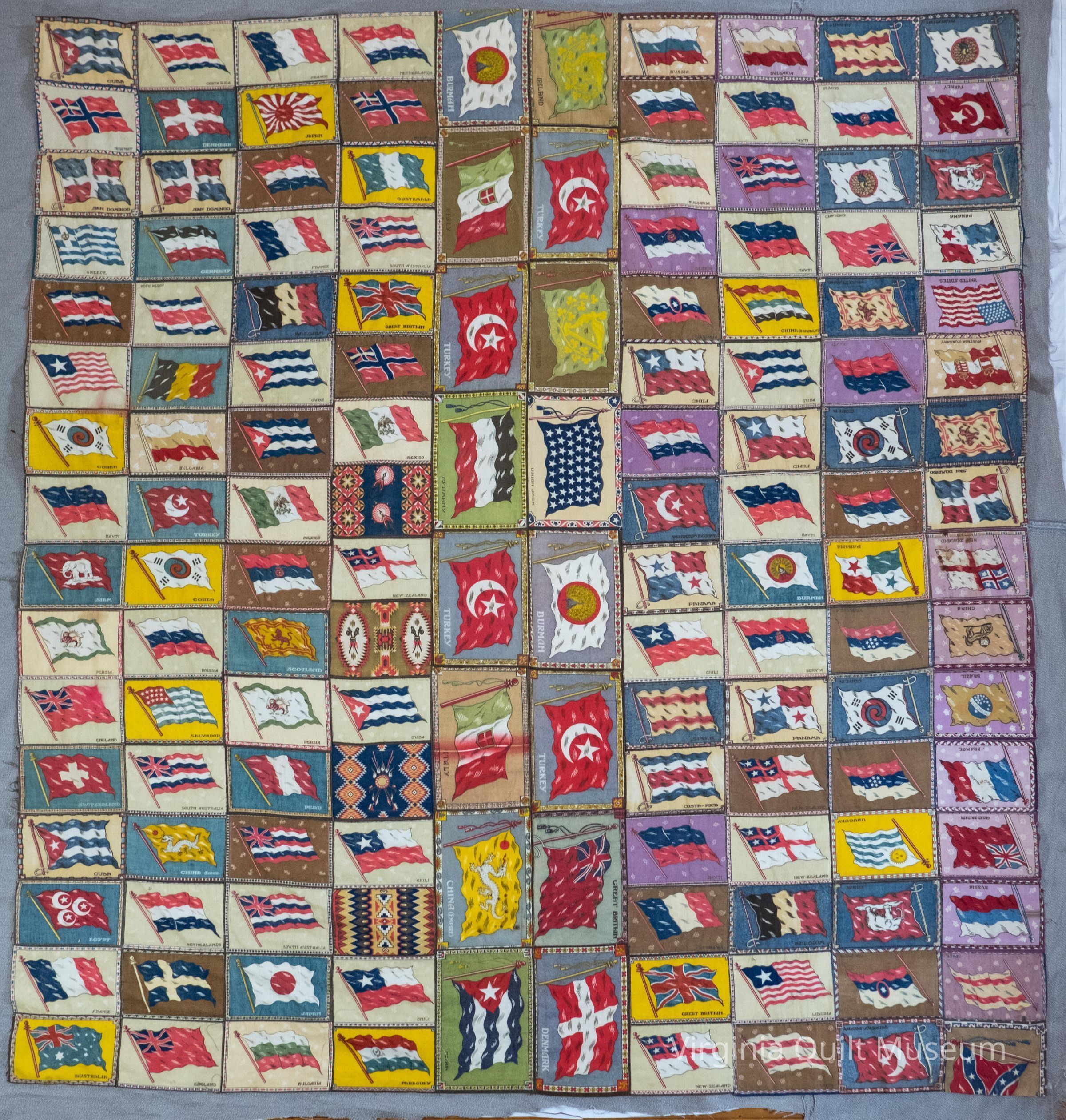 There are eight rows of premiums that measure 5" x 8" on either side of the two rows of 7" x 10" premiums. The designs on the premiums are flags of countries in existence in the early 1900's. These flannel premiums are stitched together by a sewing machine.