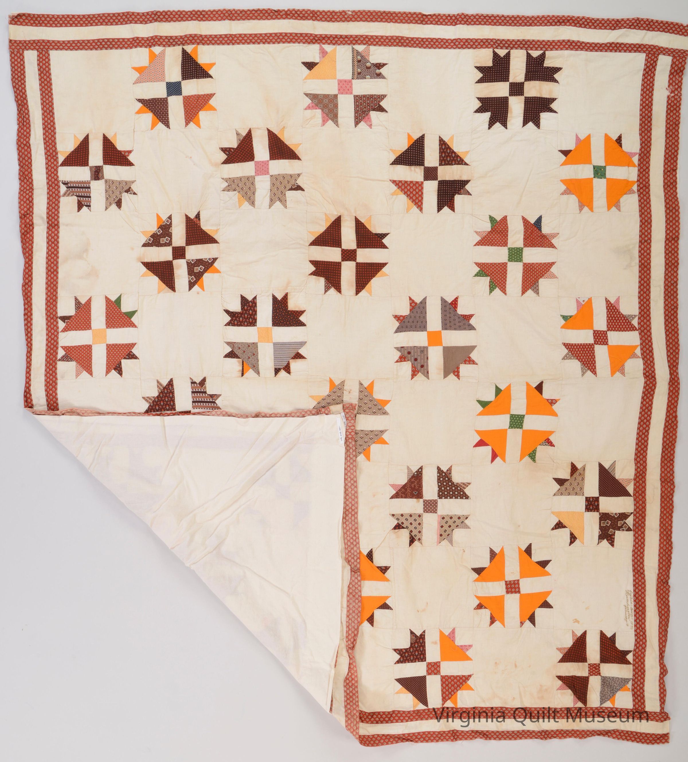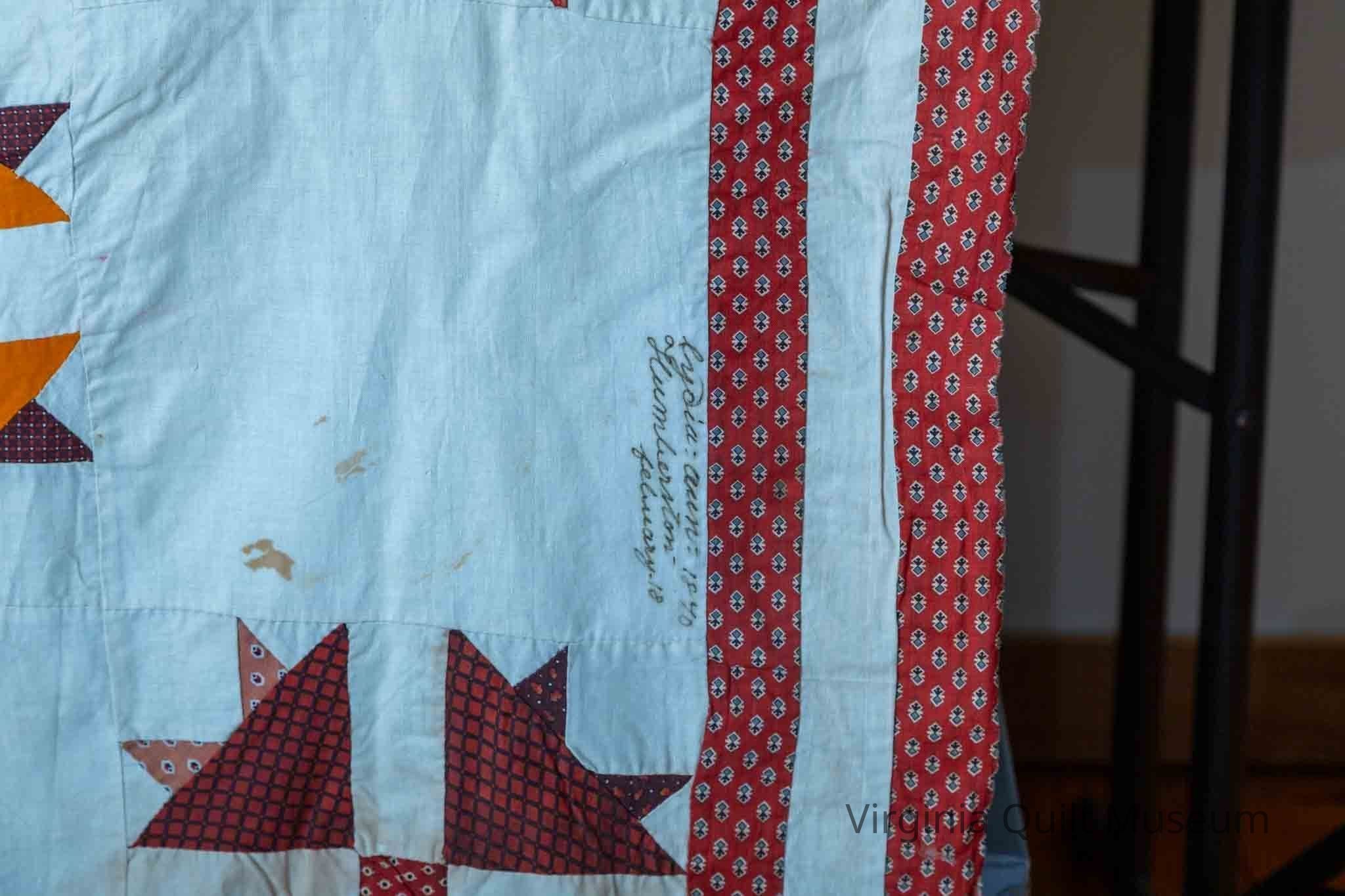 In the lower right corner, it is inked "Lydia Ann Humberston, Feb. 18, 1870." This quilt is believed to have been made in the Shenandoah Valley, and is especially appropriate for the Virginia Quilt Museum's collection - the neighboring county of Rockingham is known as the Turkey Capital of the World.Collection