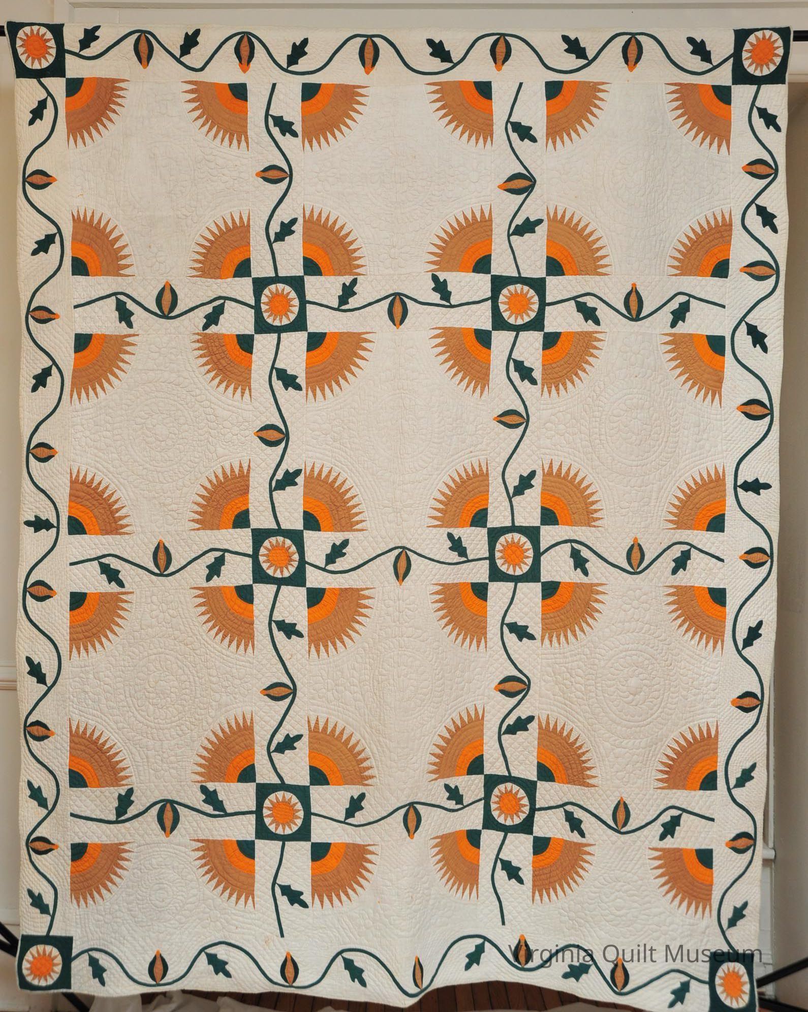 This appliquéd and pieced quilt was made using cotton fabrics at a size of 100" x 82". The nine full blocks and three half blocks are pieced in a New York beauty pattern, measuring 19 1/2" x 20". A sashing 5 3/4" wide is appliquéd vine with a bud and two leaves on each. The sashing corner block is a pieced sunflower pattern.