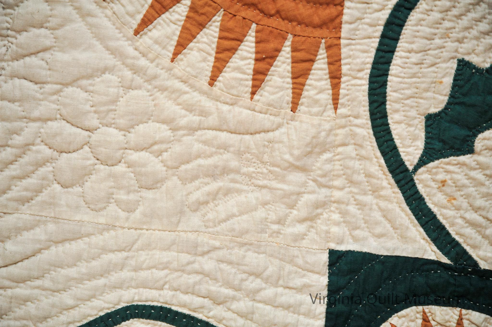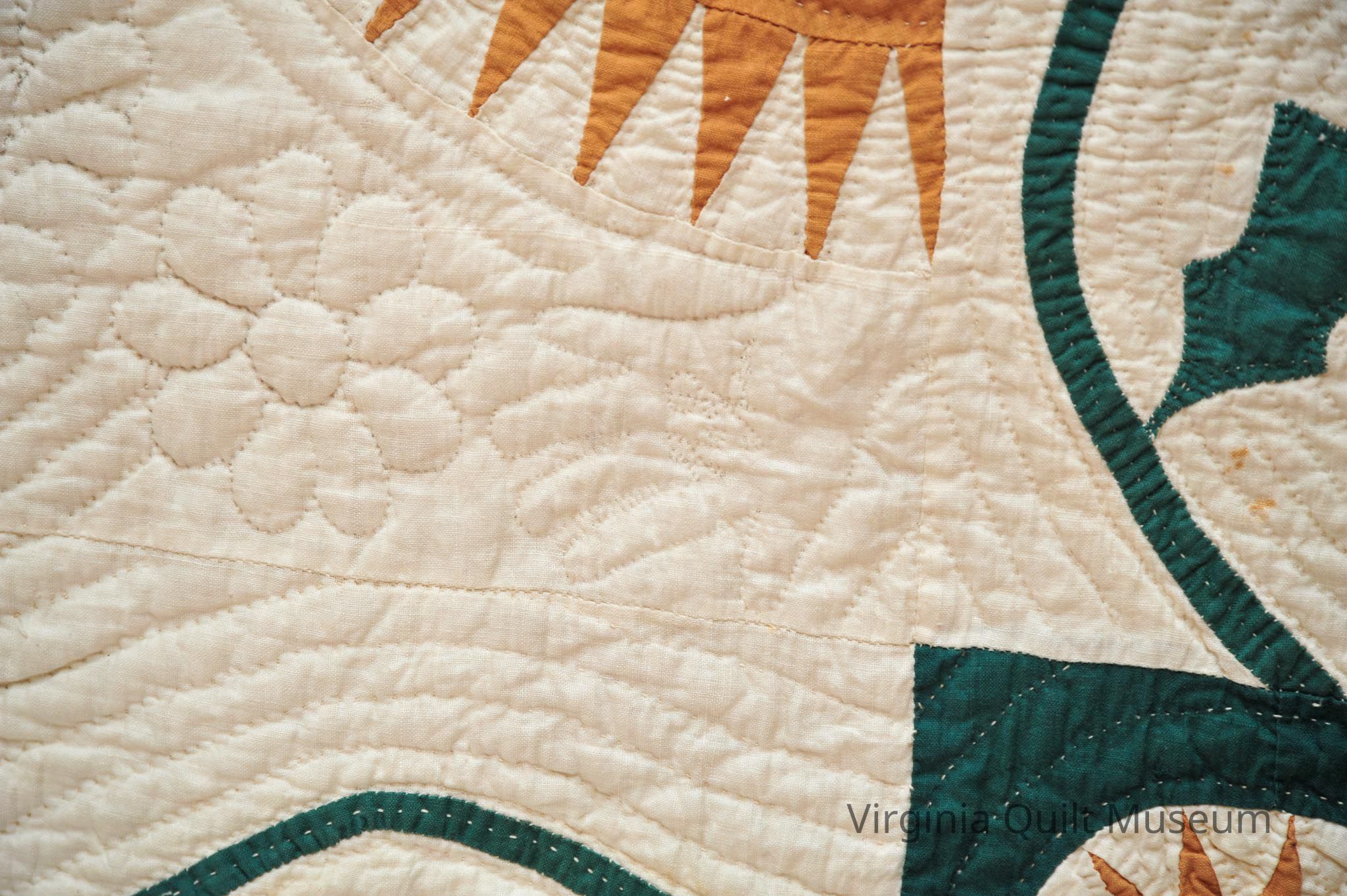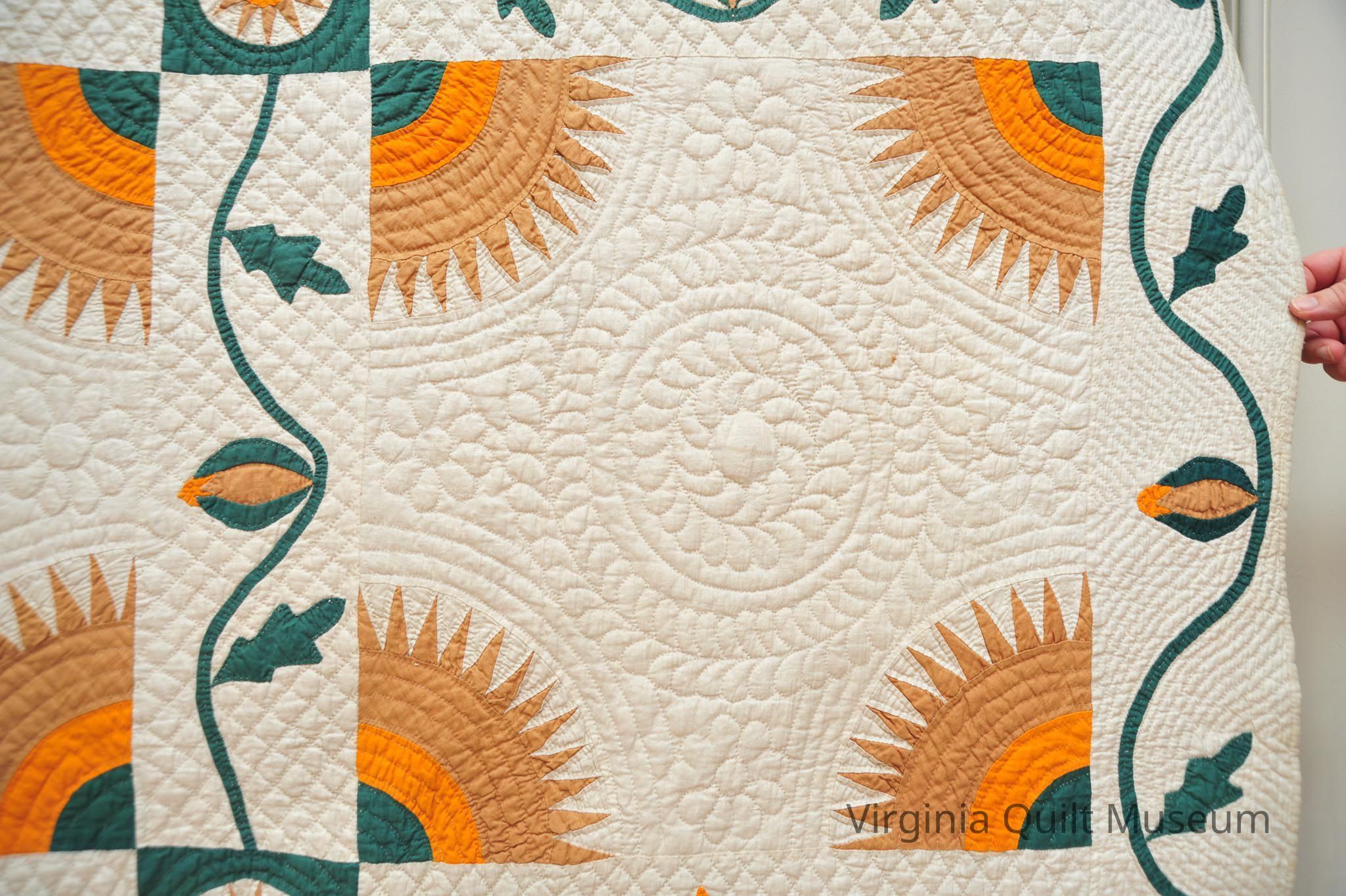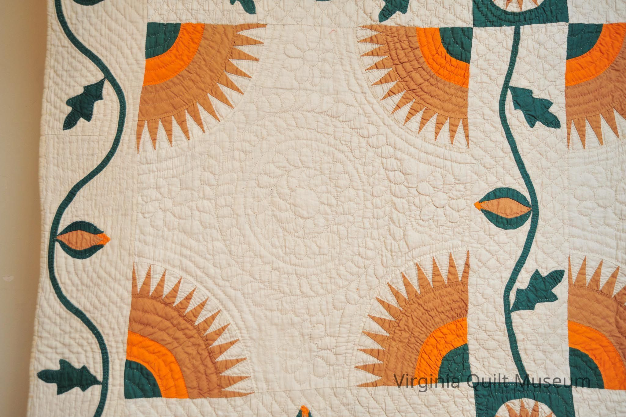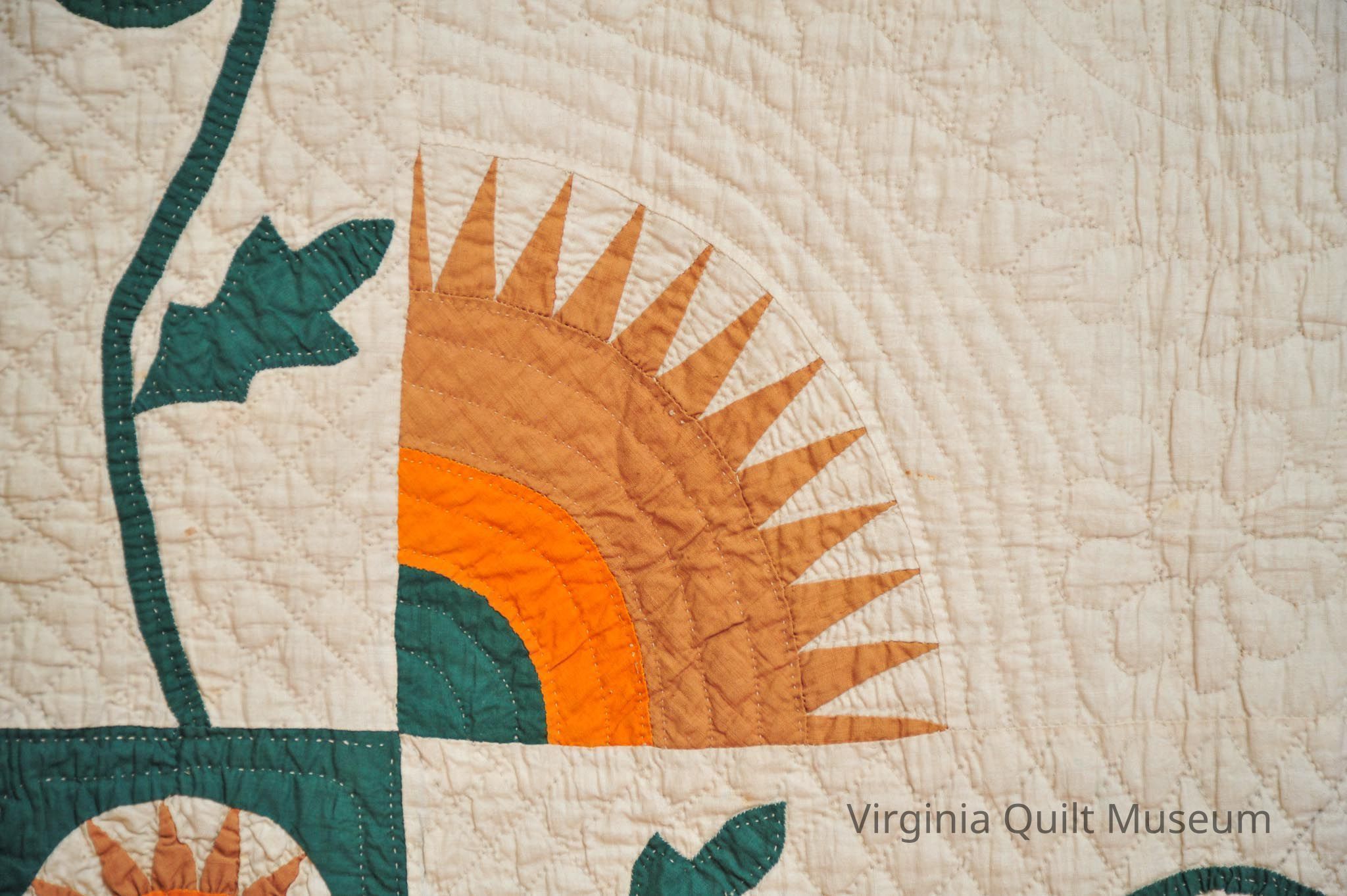 Quilting is of two feathered wreaths in each block, four sunflowers and curved lines used as filler. Points of pieced work is outlined and curved lines. Border has echo lines while sashing is cross hatching with quilting in appliqué. The quilting is nicely executed.Context