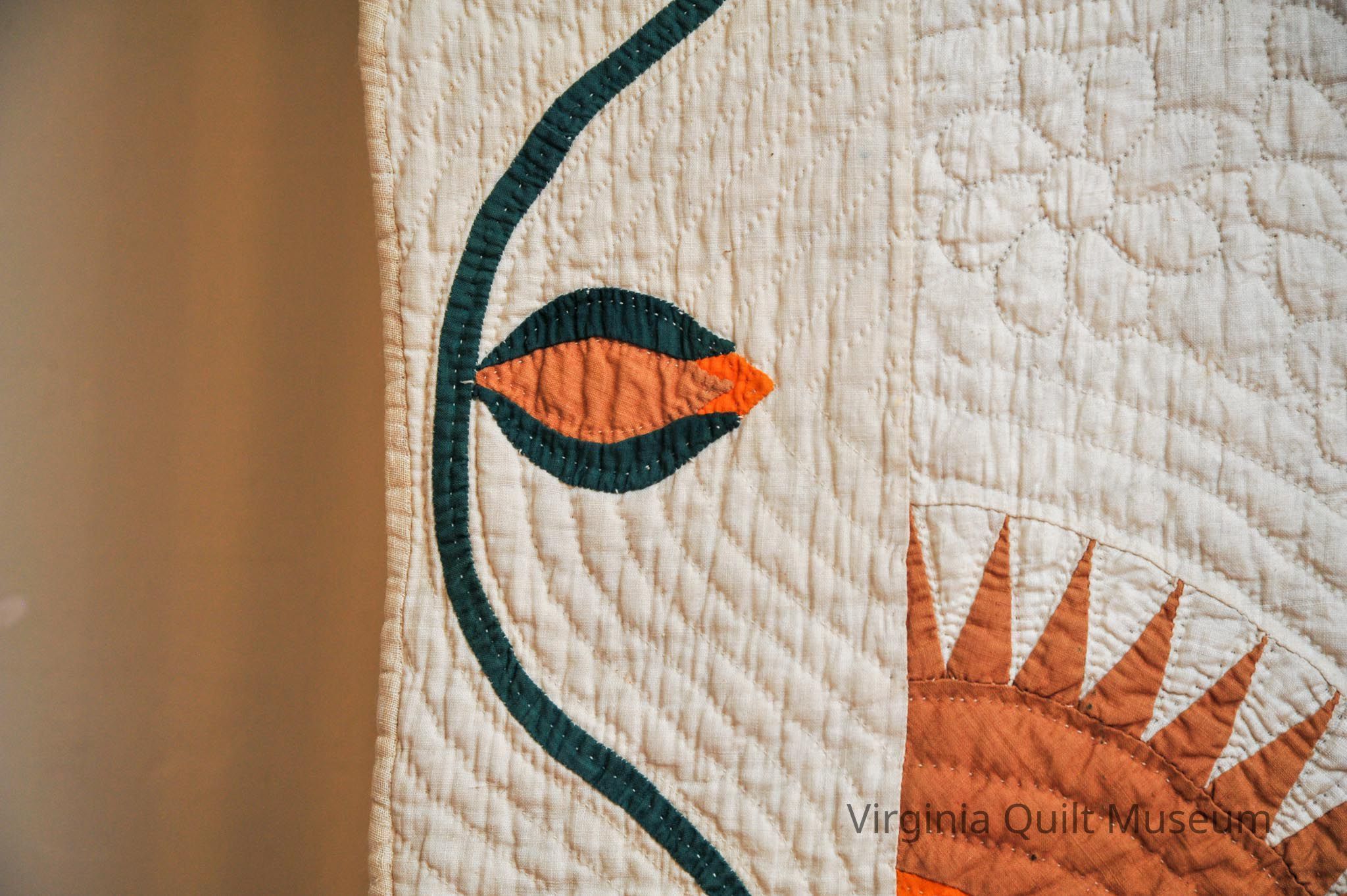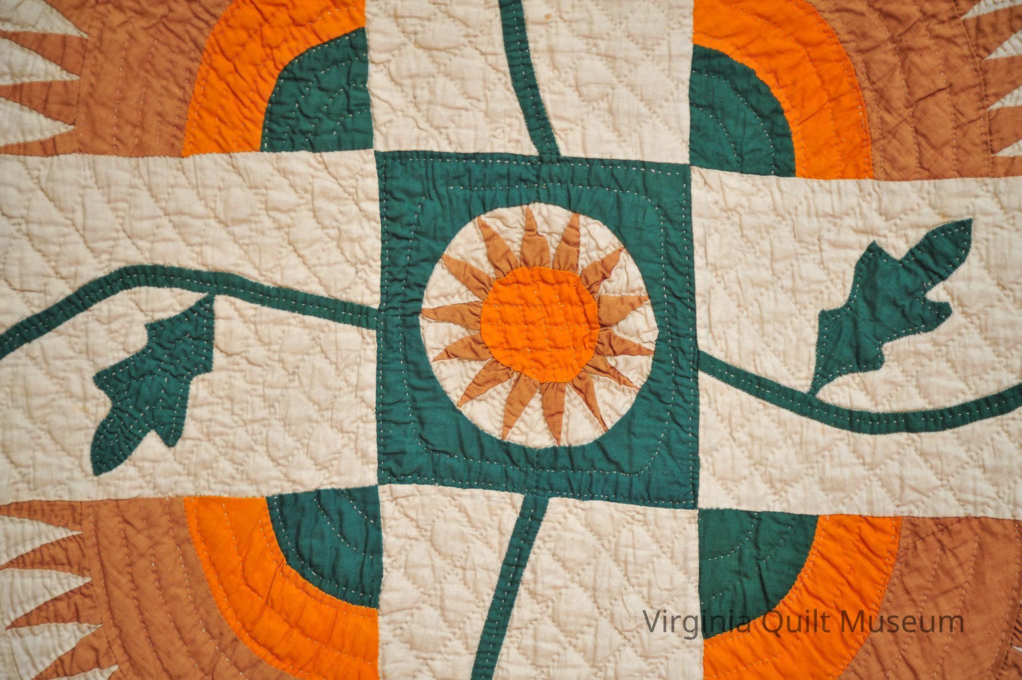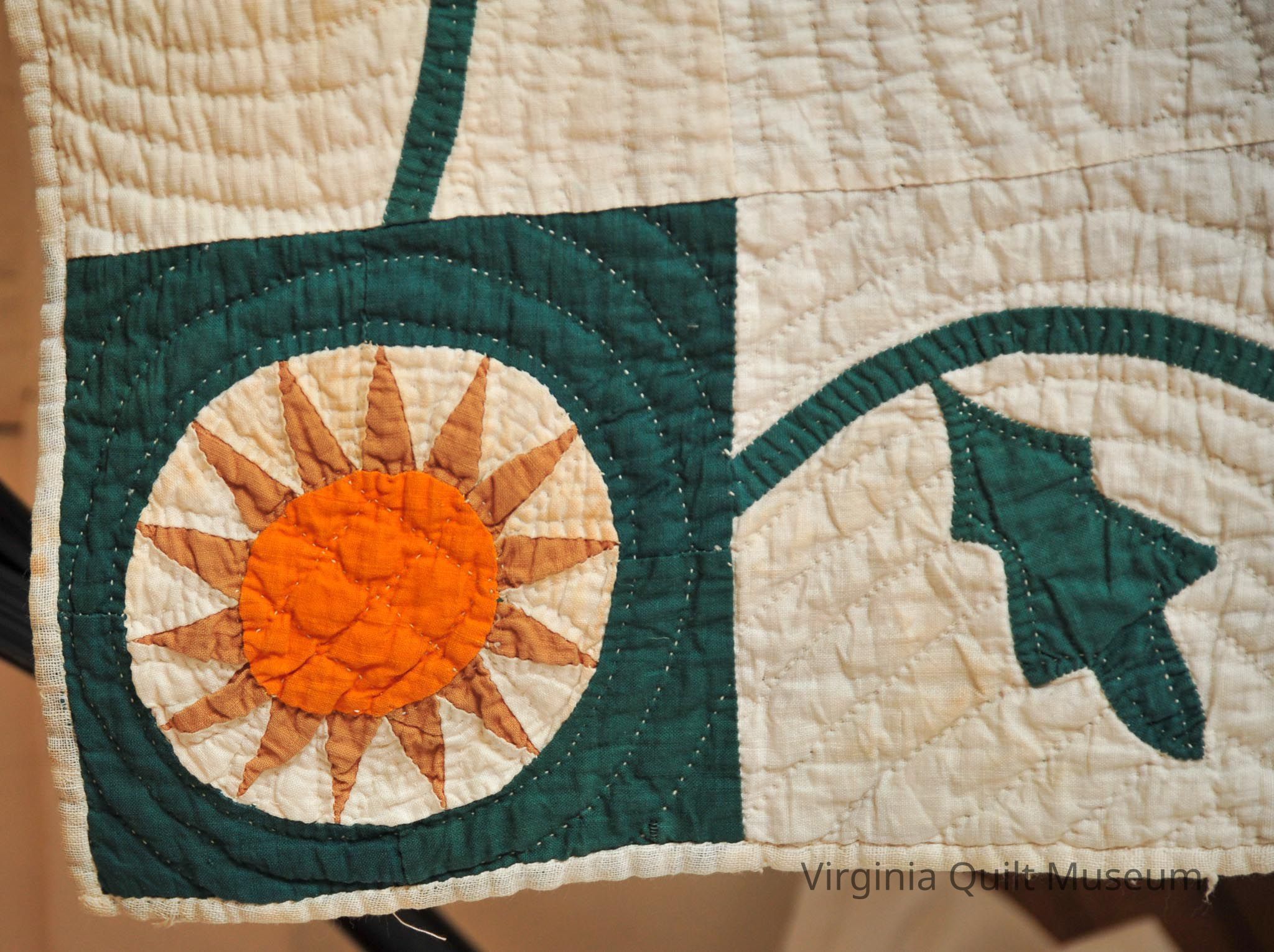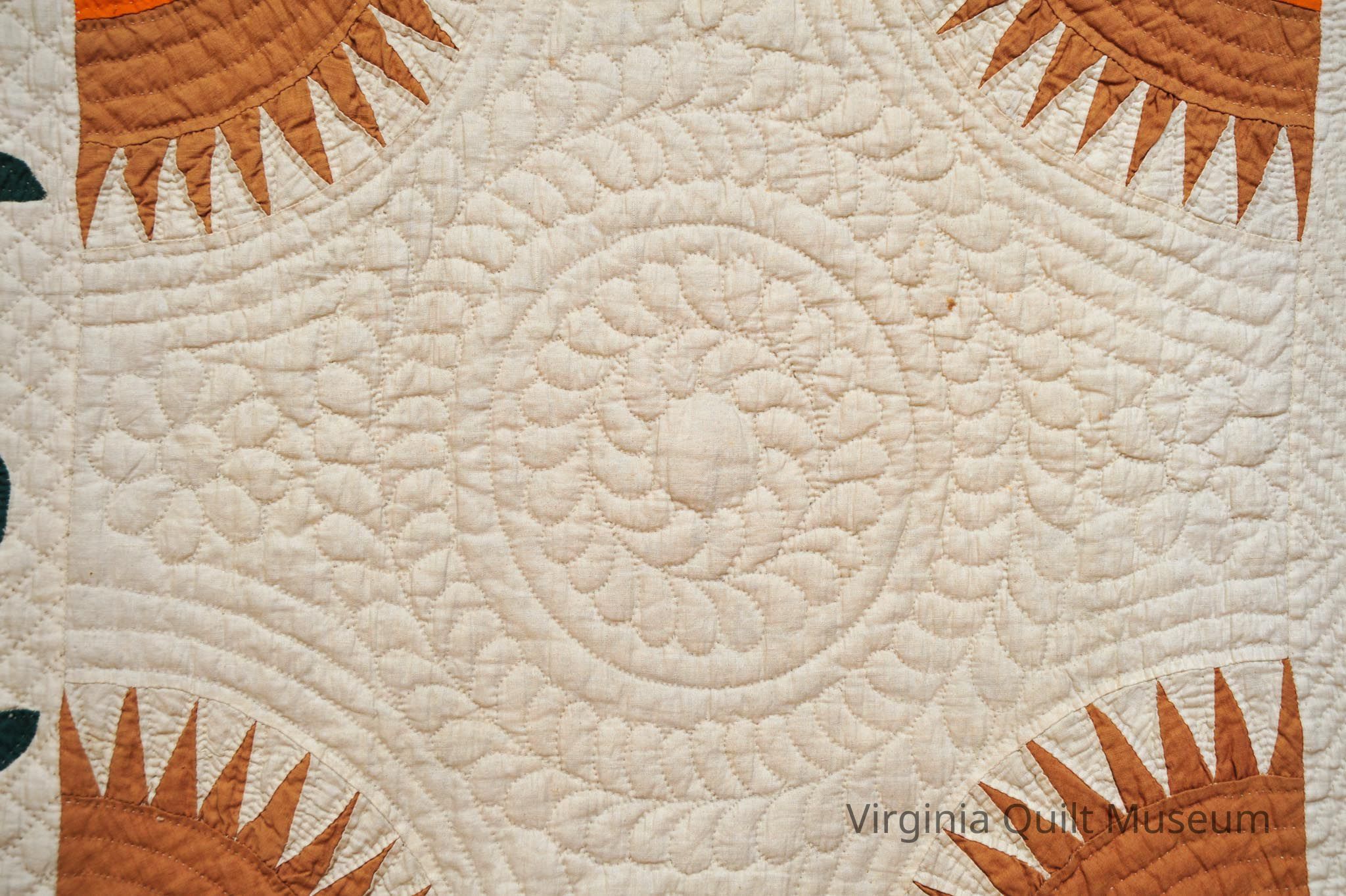 Quilting is of two feathered wreaths in each block, four sunflowers and curved lines used as filler. Points of pieced work is outlined and curved lines. Border has echo lines while sashing is cross hatching with quilting in appliqué. The quilting is nicely executed.Context