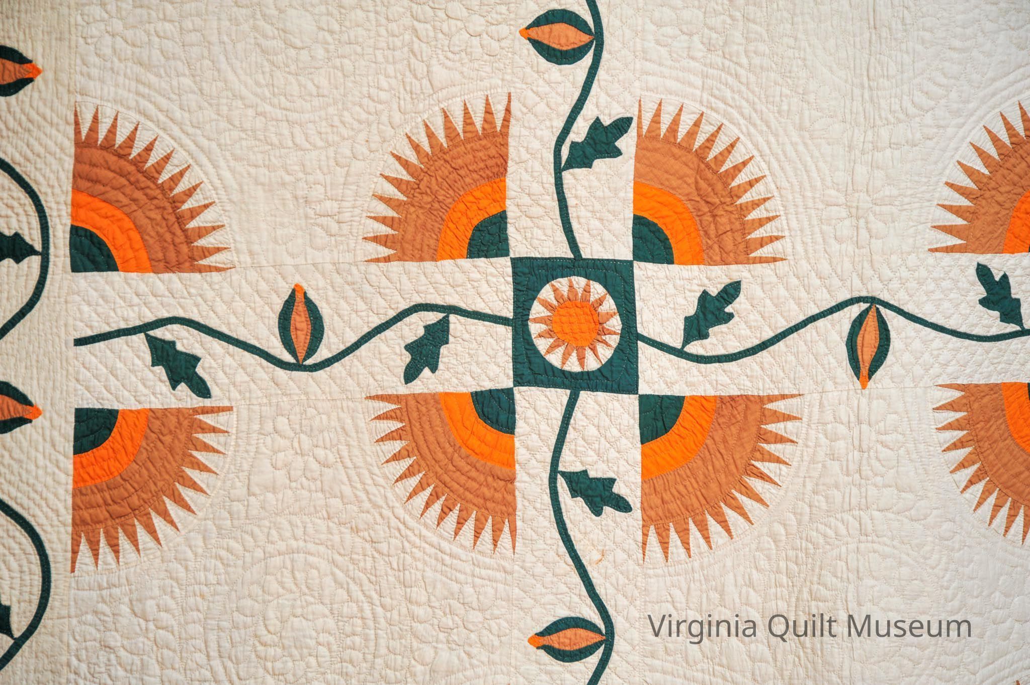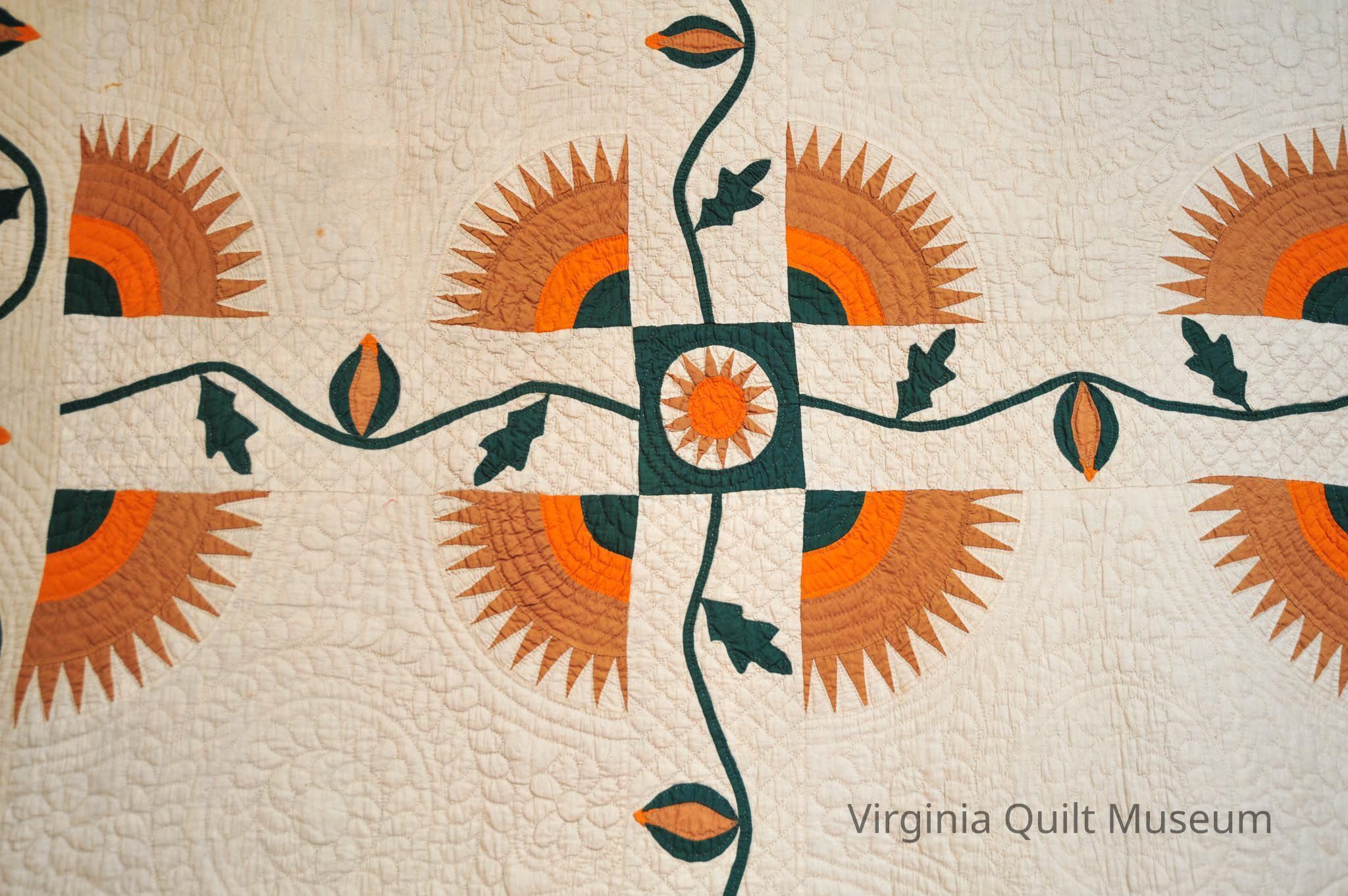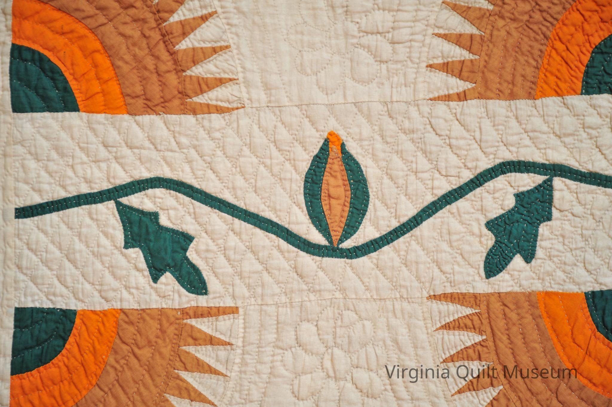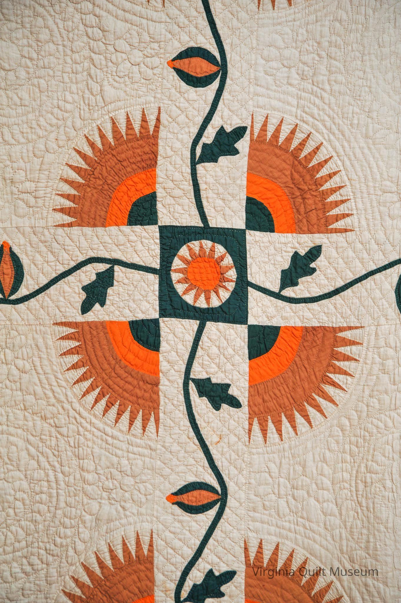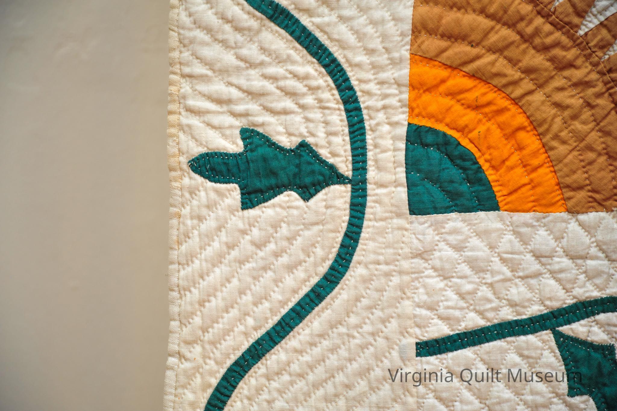 Quilting is of two feathered wreaths in each block, four sunflowers and curved lines used as filler. Points of pieced work is outlined and curved lines. Border has echo lines while sashing is cross hatching with quilting in appliqué. The quilting is nicely executed.Context