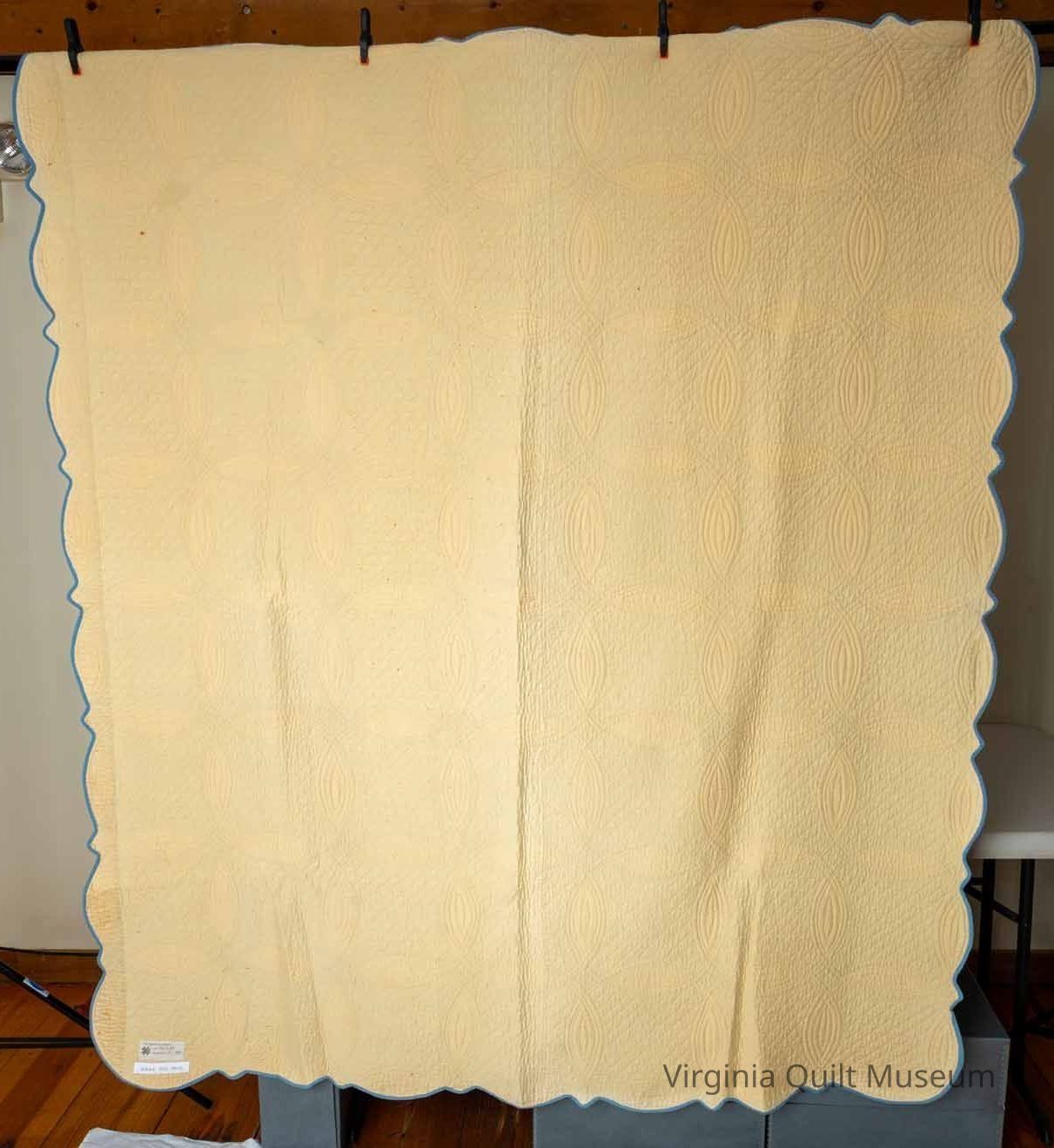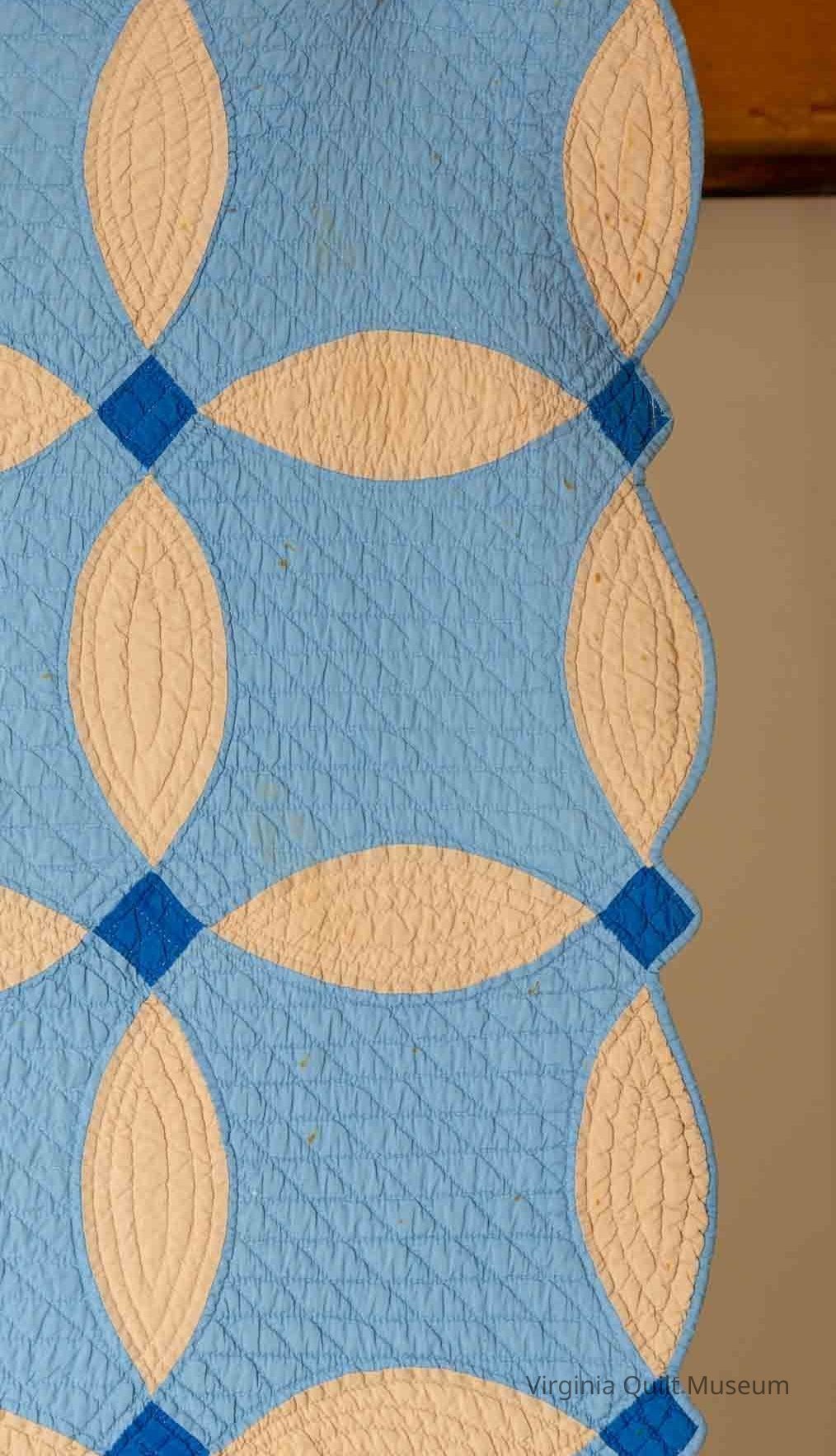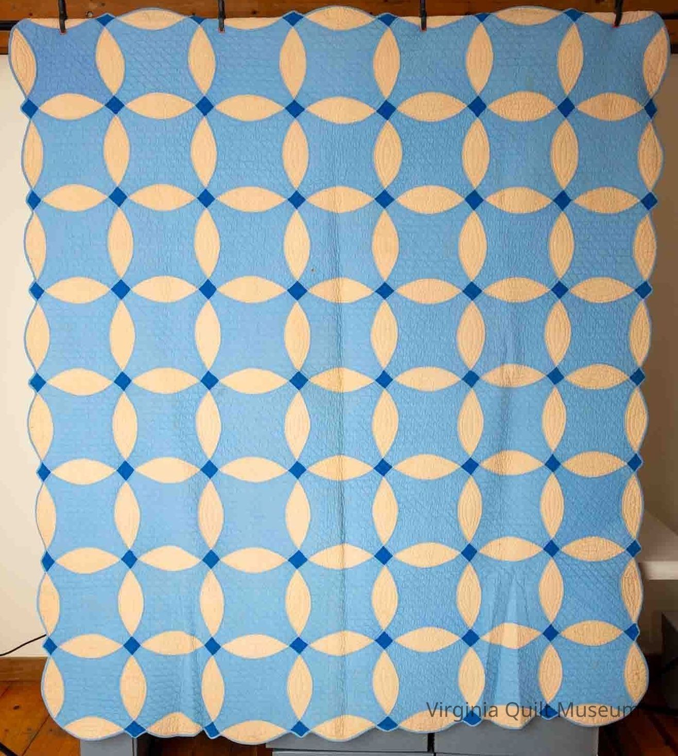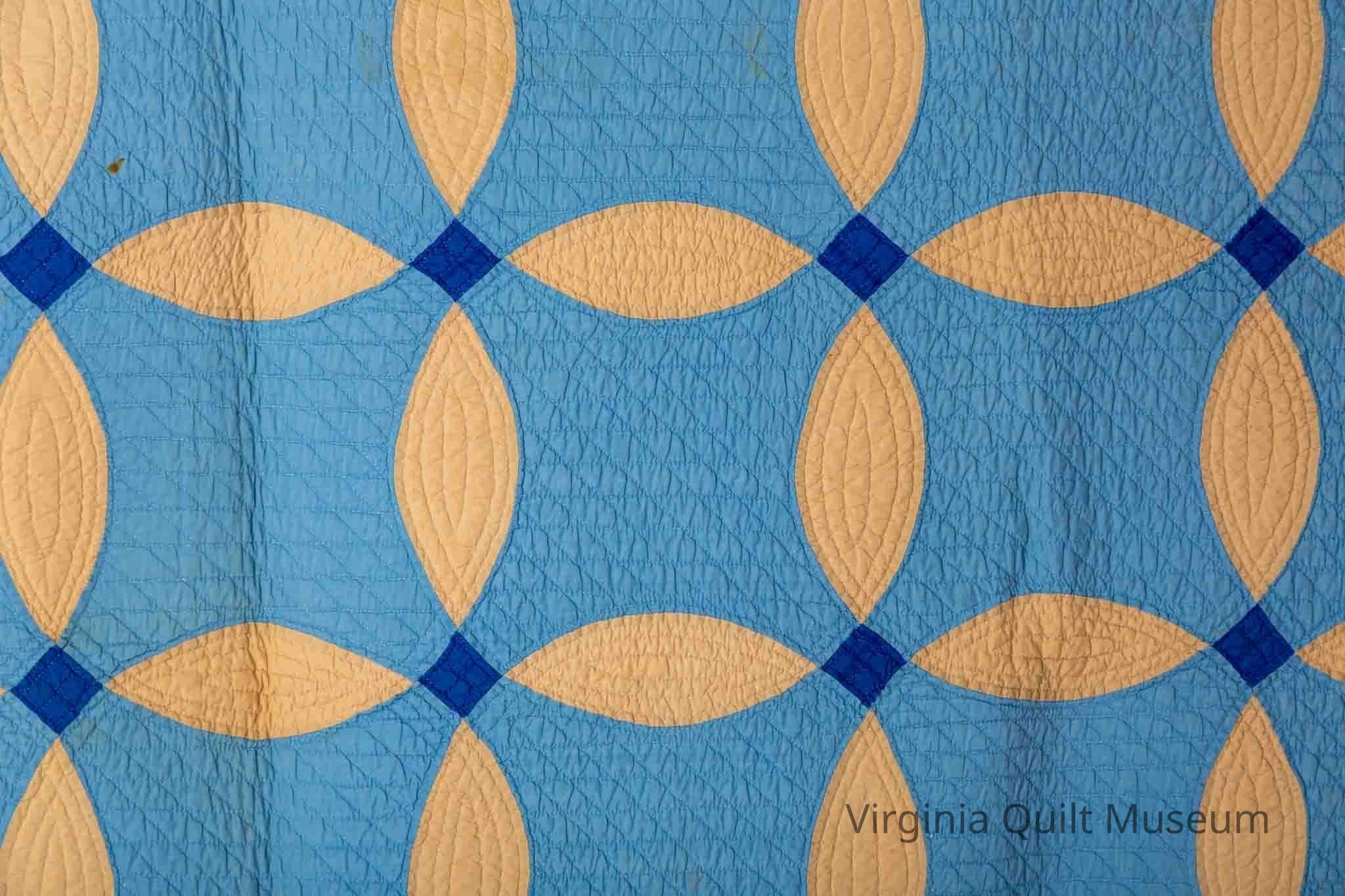 This quilt features a solid blue and off-white/tan orange peel pattern. There are 56 blocks in total, arranged into a grid of 7 x 8. The blocks are set in straight, block to block. The sashing between the light blue blocks are 3'' x 7.5'' and the royal blue cornerstones are 1.5'' square. It was hand quilted in a grid pattern that follows the design of the quilt. There are diagonal line that form diamonds in the light blue sections, four squares in the dark blue and echo quilting in the crescent shapes. It measures 9-10 stiches per inch using single white cotton thread. The binding is a light blue, hand stitched, applied, measuring about ¼’’ wide and scalloped edges.