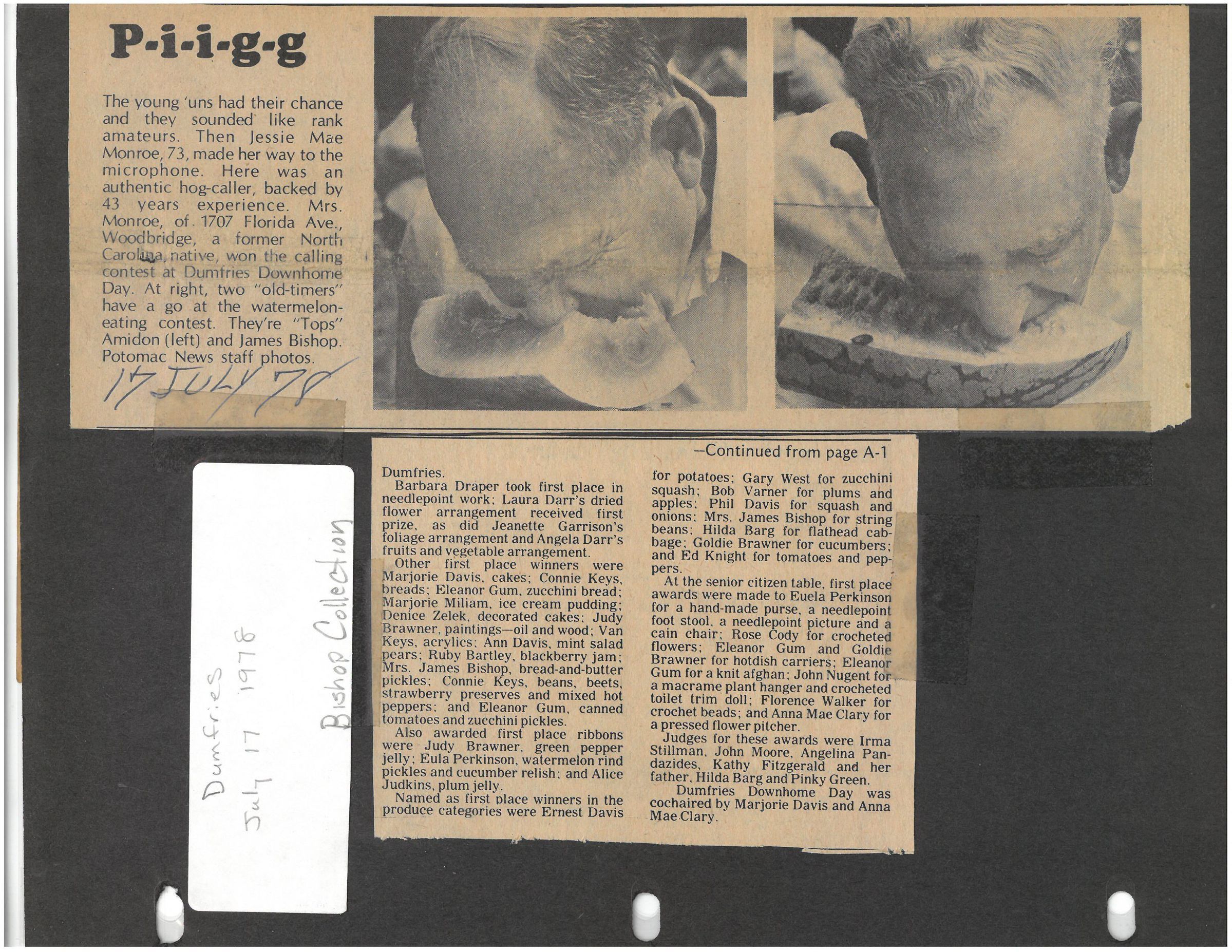 Dumfries Downhome Day was cochaired by Marjorie Davis and Anna Mae Clary.Transcriber