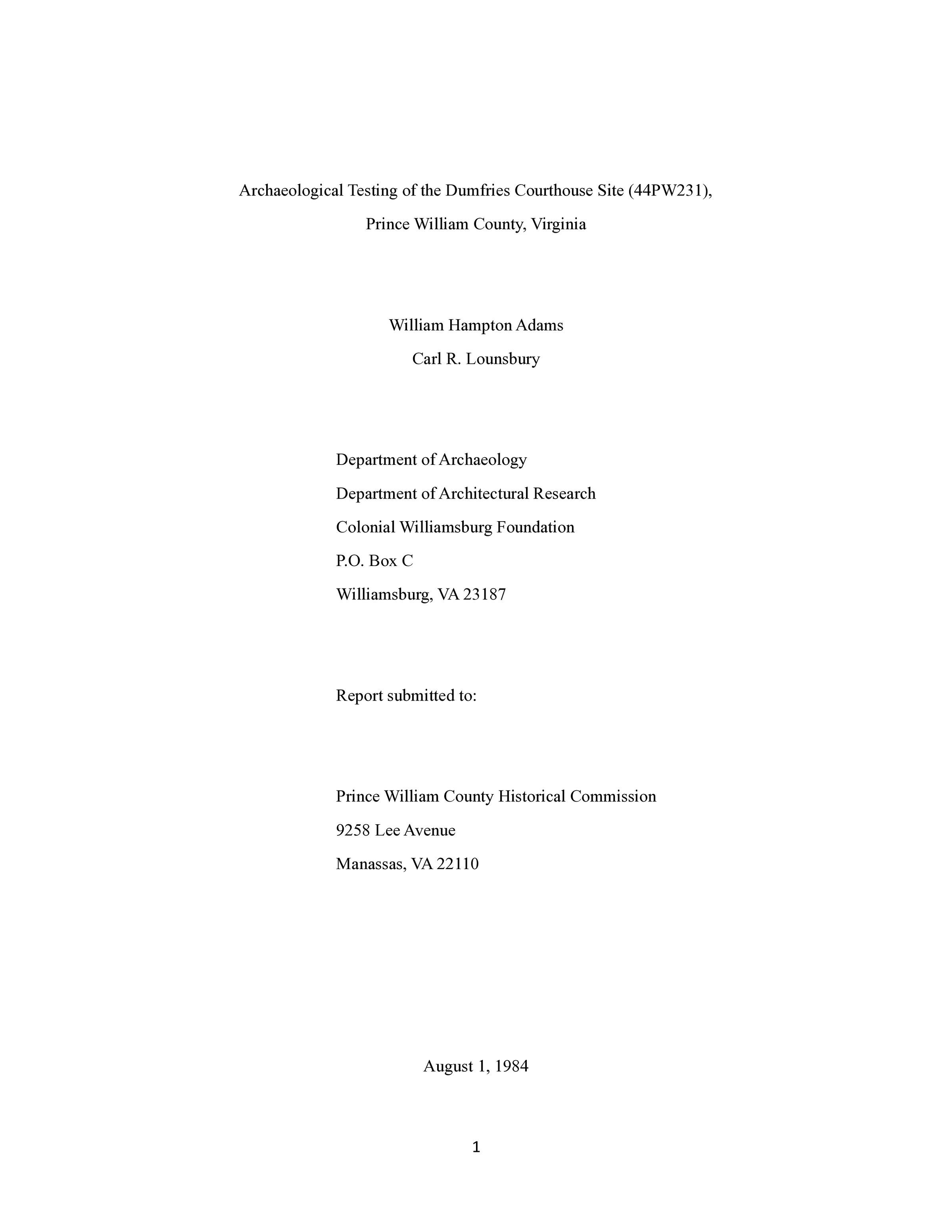Funding for this project was provided by the Prince William County Historical Commission. We would like to thank the Commission for the opportunity to undertake this research on the historic courthouse at Dumfries. We especially thank Mrs. Lorraine Dow, Chair of the Commission for her assistance and hospitality. Mr. John Schofield of the Prince William County Planning Commission administered the contract and provided valuable logistical support. Mr. Lee Lansing, Dumfries Town Historian, assisted our efforts throughout the project by arranging for the colonial baseline to be surveyed nearby and seeing that the courthouse area was mowed just prior to our arrival. In addition, his knowledge of the history of Dumfries proved very useful to us. Mayor Olney A. Brawner provided assistance and enthusiasm throughout the project. We would also like to thank the many citizens of Dumfries who visited the site and brought us water during the heat wave experienced that week.