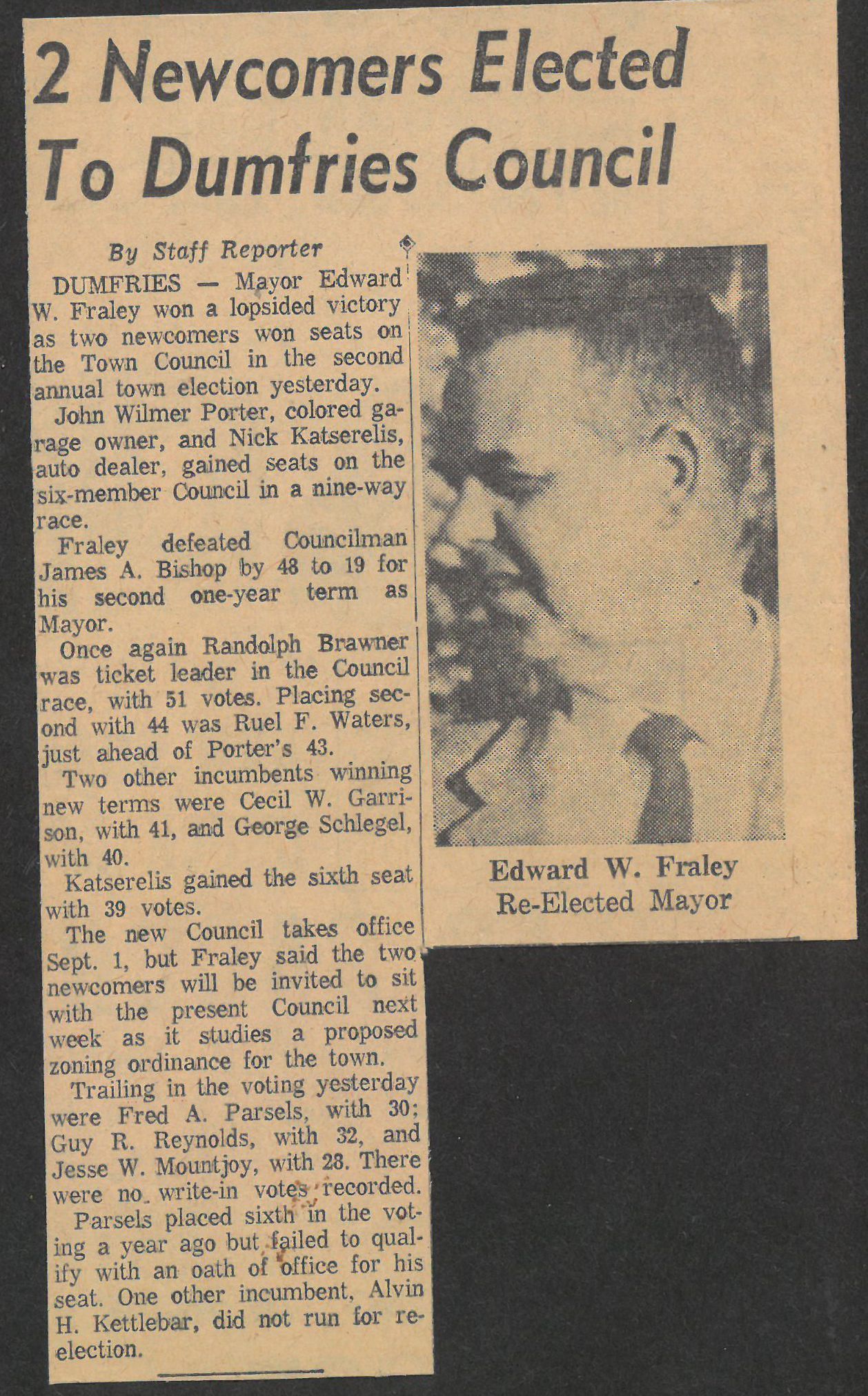 Dumfries- Mayor Edward W. Fraley won a lopsided victory as two newcomers won seats on the Town Council in the second annual town election yesterday.