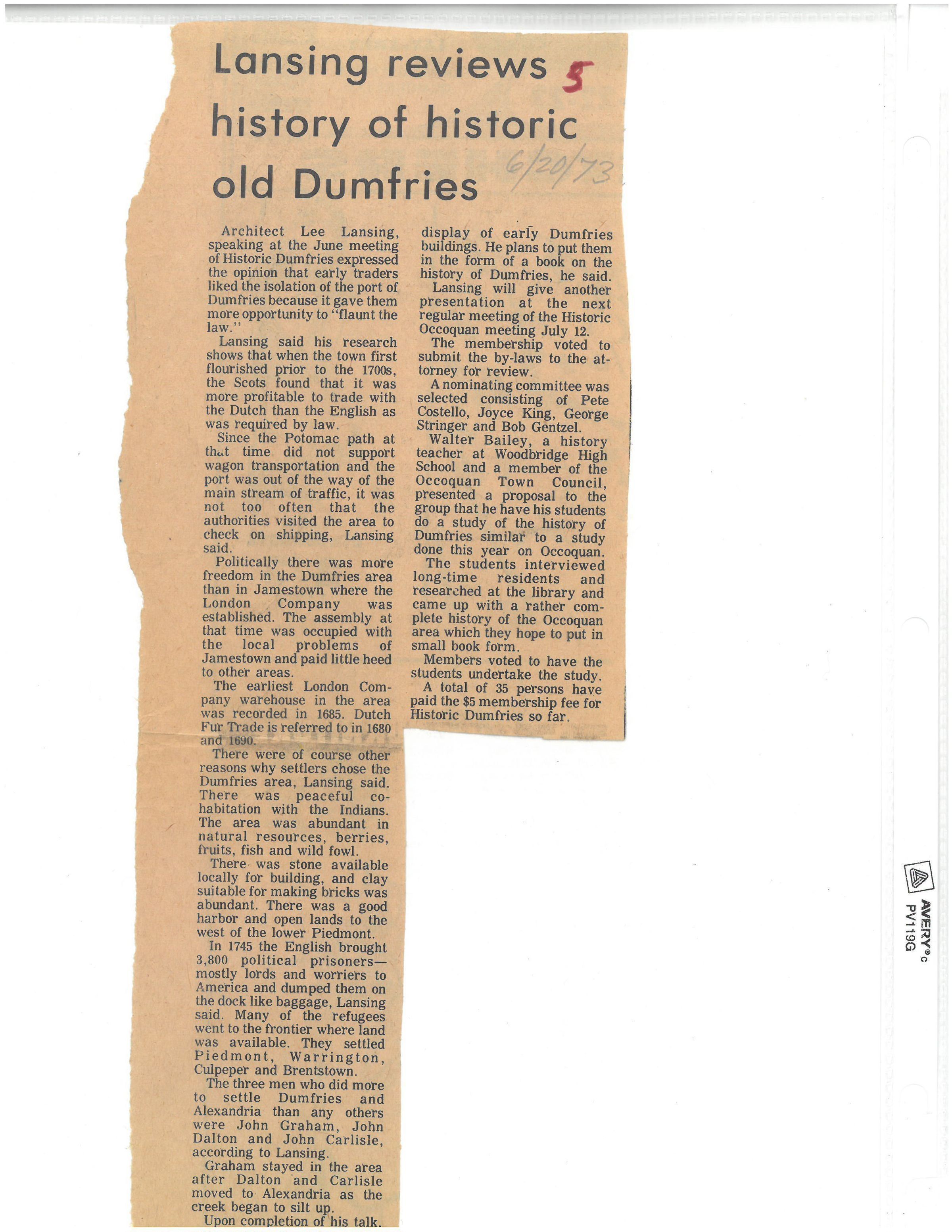 Walter Bailey, a history teacher at Woodbridge High School and a member of the Occoquan Town Council, presented a proposal to the group that he have his students do a study of the history of Dumfries similar to a study done this year on Occoquan.