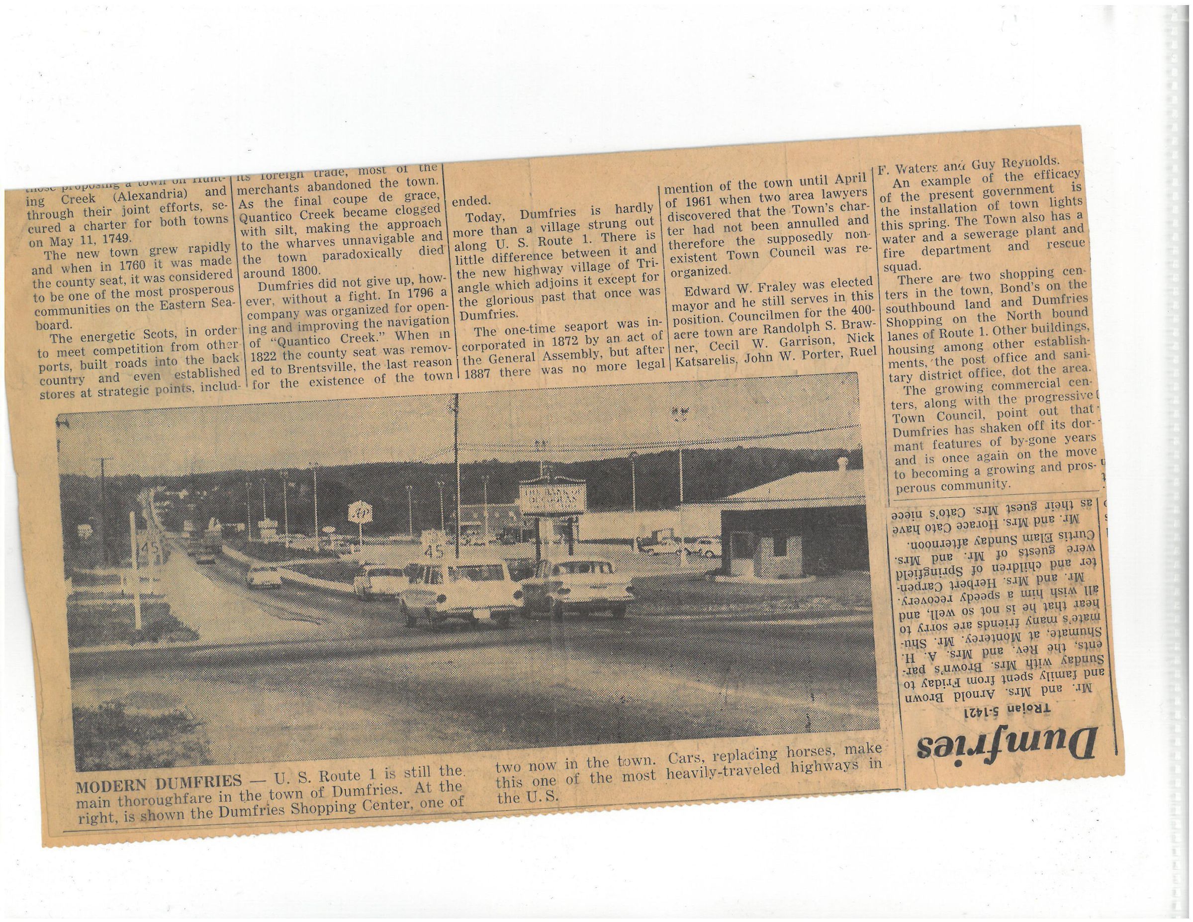 Modern Dumfries- U.S. Route 1 is still the main throughfare in the town of Dumfries. At the right is shown the Dumfries shopping center, one of two now in the town. Cars, replacing horses. Making this one of the most heavily- traveled highways in the U.S.Transcriber
