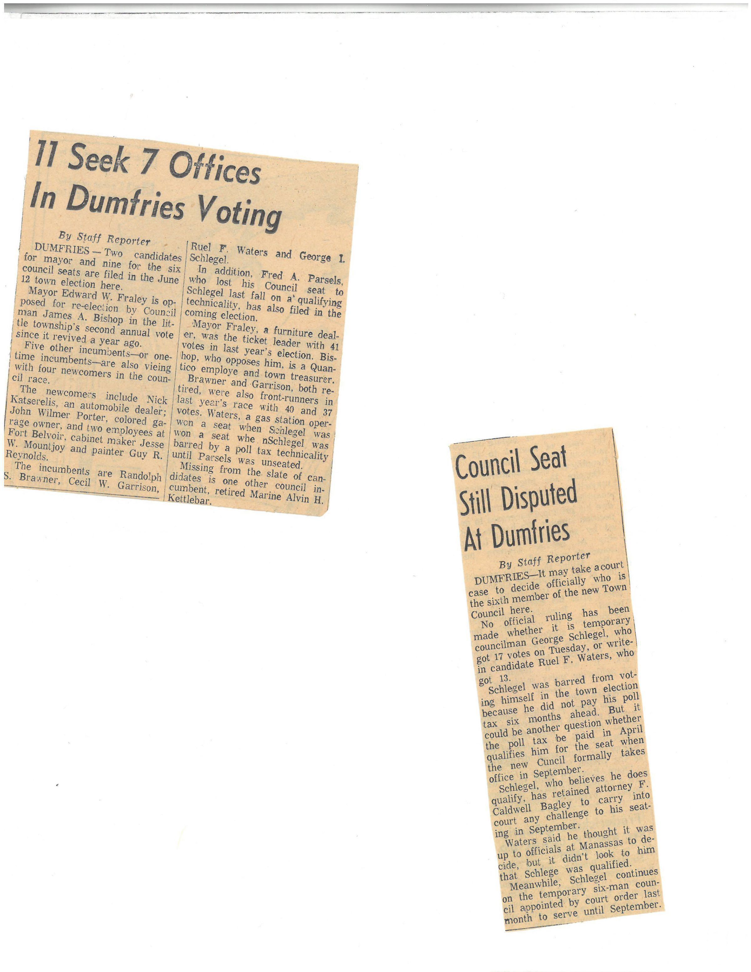 DUMFRIES- Two candidates for mayor and nine for the six council seats are filed in the June 12 town election here.