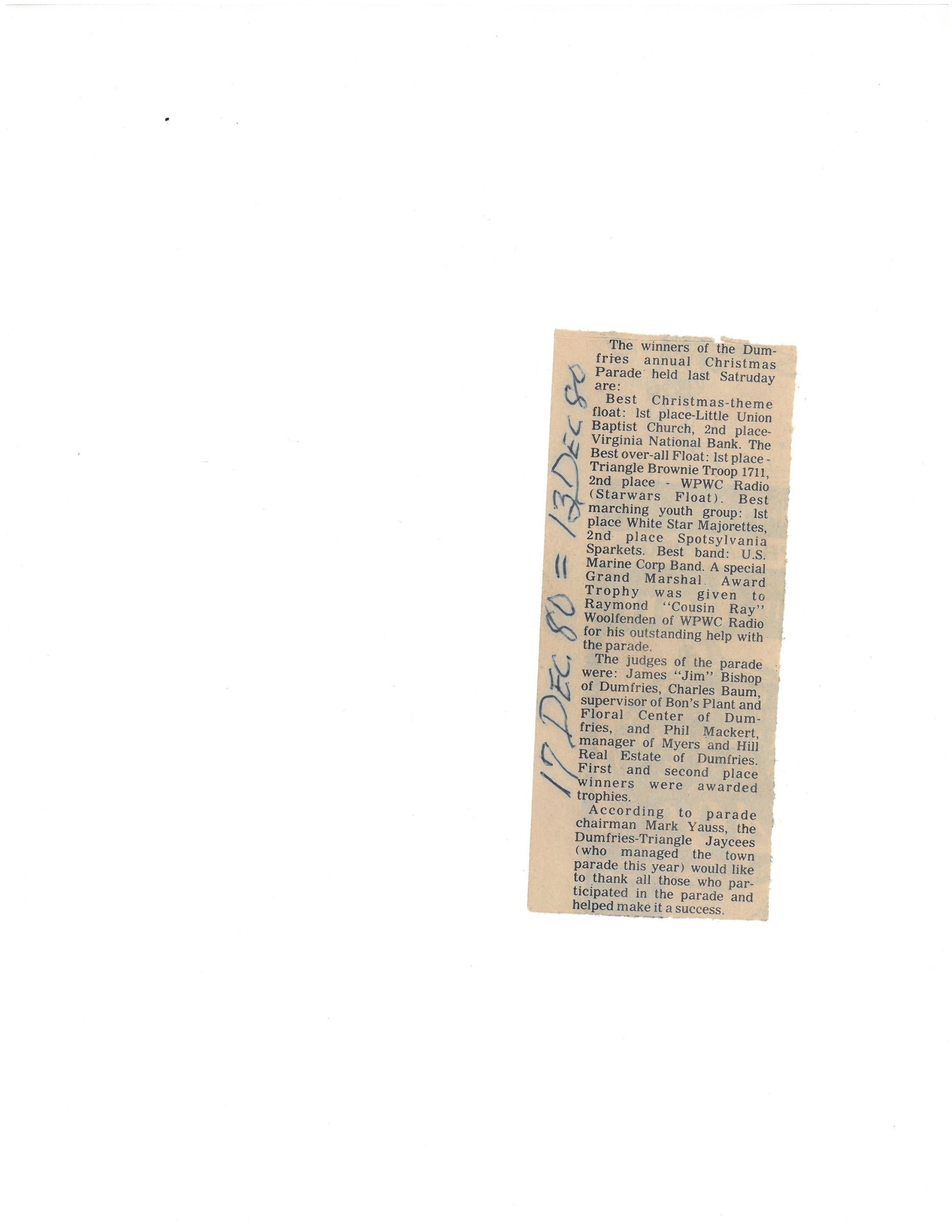 Best Christmas-theme float: 1st place-little Union Baptist Church, 2nd place Virginia National Bank. The Best over-all Float: 1st place Triangle Brownine Troop 1711, 2nd place- WPWC Radio (Star wars Float). Best marching youth group: 1st place White Star Majorettes, 2nd place Spotsylvania sparkets. Best band: U.S. Marine Corp Band. A special Grand Marshal Award Trophy was given to Raymond "Cousin Ray" Woolfenden of WPWC Radio for his outstanding help with the parade.