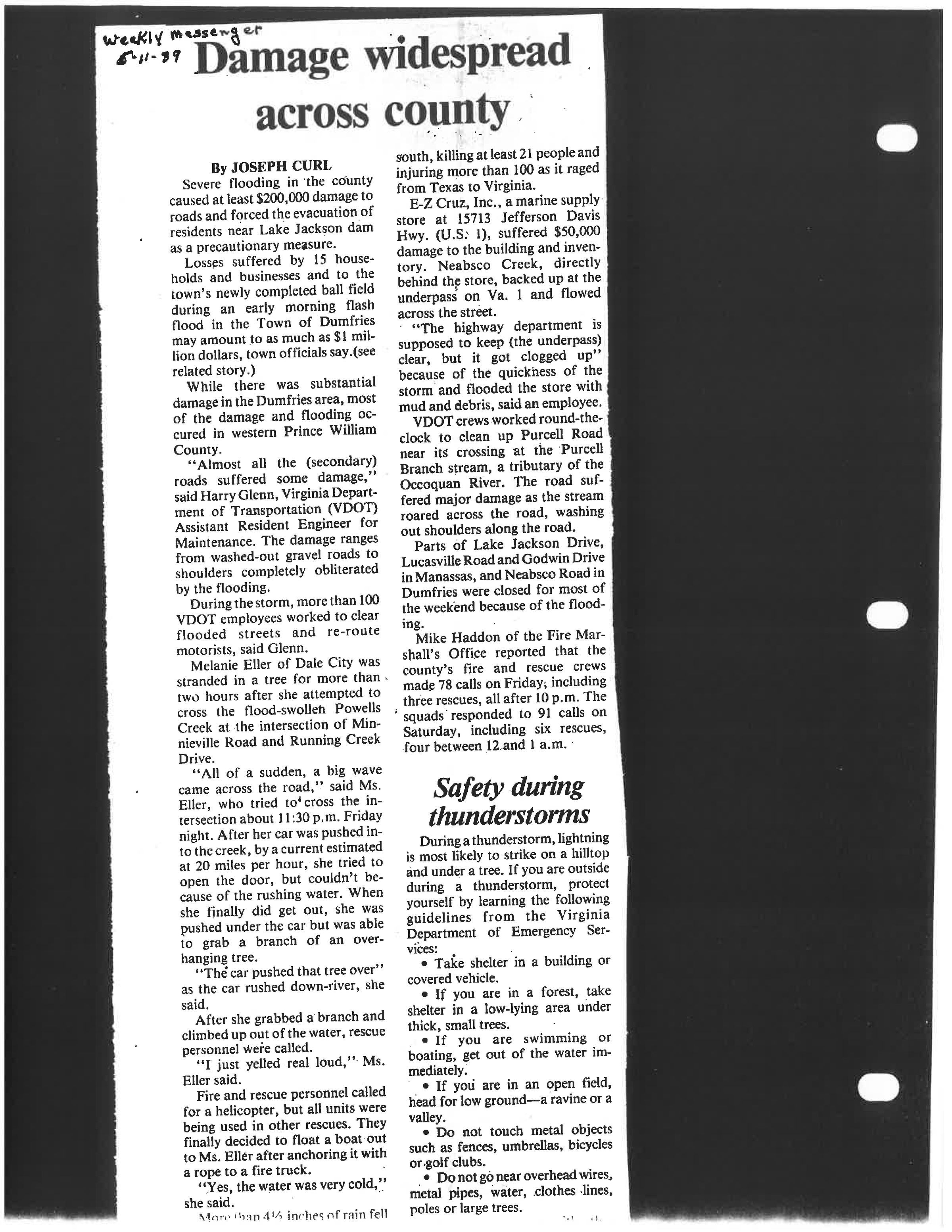 E-Z cruz, Inc., a marine supply store at 15713 Jefferson Davis Hwy. (U.S. 1), suffered $50,000 damage to the building and inventory. Neabsco Creek, directly behind the store, backed up the underpass on Va. 1 and flowed across the street.