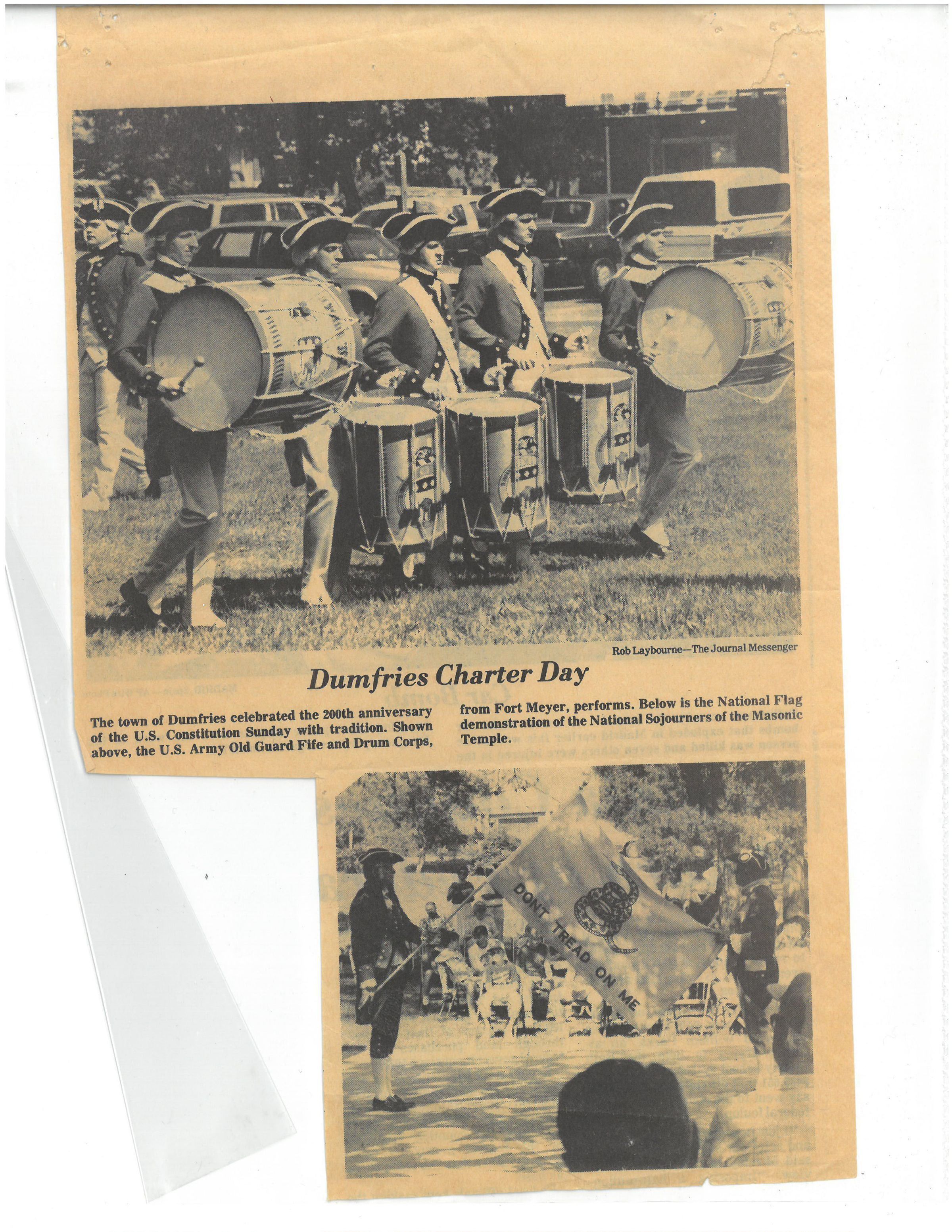 Dumfries Charter Day The town of Dumfries celebrated the 200th anniversary of the U.S. Constitution Sunday with tradition. Shown above, the U.S. Army Old Guard Fife and Drum Corps, from Fort Meyer, performs. Below is the National flag demonstration of the National Sojourners of the Masonic Temple.