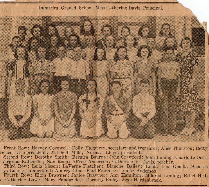 Front Row: Harvey Cornwell; Dully Haggerty, secretary and treasurer; Alice Thurston; Betty Lovelace, vice-president; Mitchell Mills; Norman Lloyd, president. Second Row: Dorothy Smith; Bernice Bourne; John Crawford; John Liming; Charlotte [Oert-?] Virginia Katsarills; Nan Roop; Alfred Anderson; Catherine V. Davis, teacher. Third Row: Leila Sisson; LaVerne Fletcher; Blanche Bailey; Linda Lou Gnadt; Snookie [??ery?]; Louise Cumberland; Audrey Ginn; Paul Florence; Louise Anderson. Fourth Row: Elgin Brawner; Janice Brawner; Ann Hamilton; Mildred Liming; Ethel [Hed-??]; Catherine Lowe; Mary Pandazides; Dorothy Bailey ; Jean Hardenbrook.