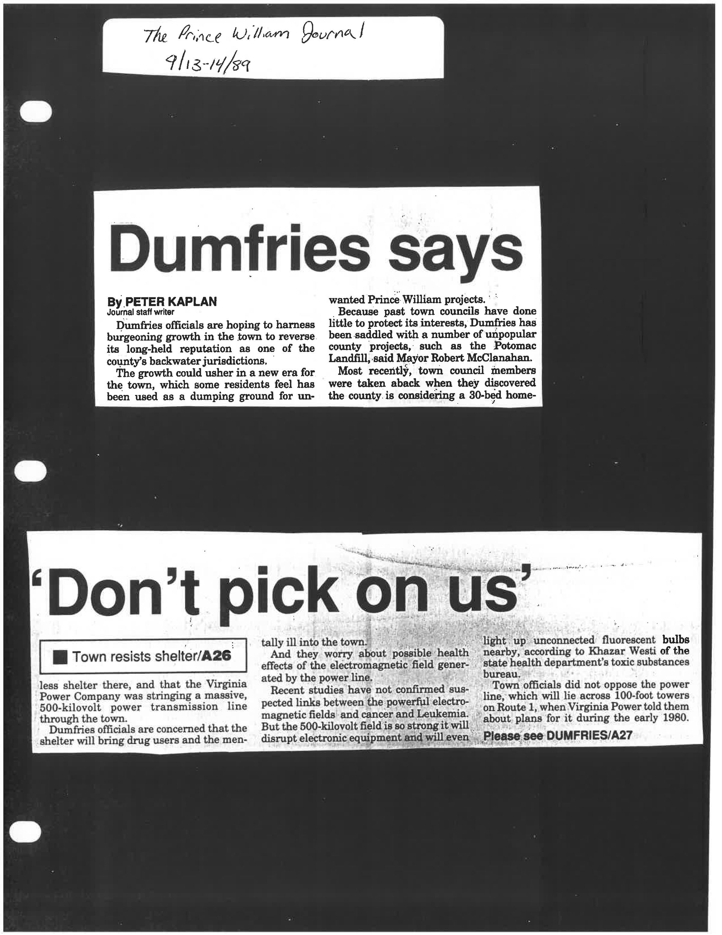 Because past town councils have done little to protect its interests, Dumfries has been saddled with a number of unpopular county projects, such as the Potomac Landfill, said Mayor Robert McClanahan.