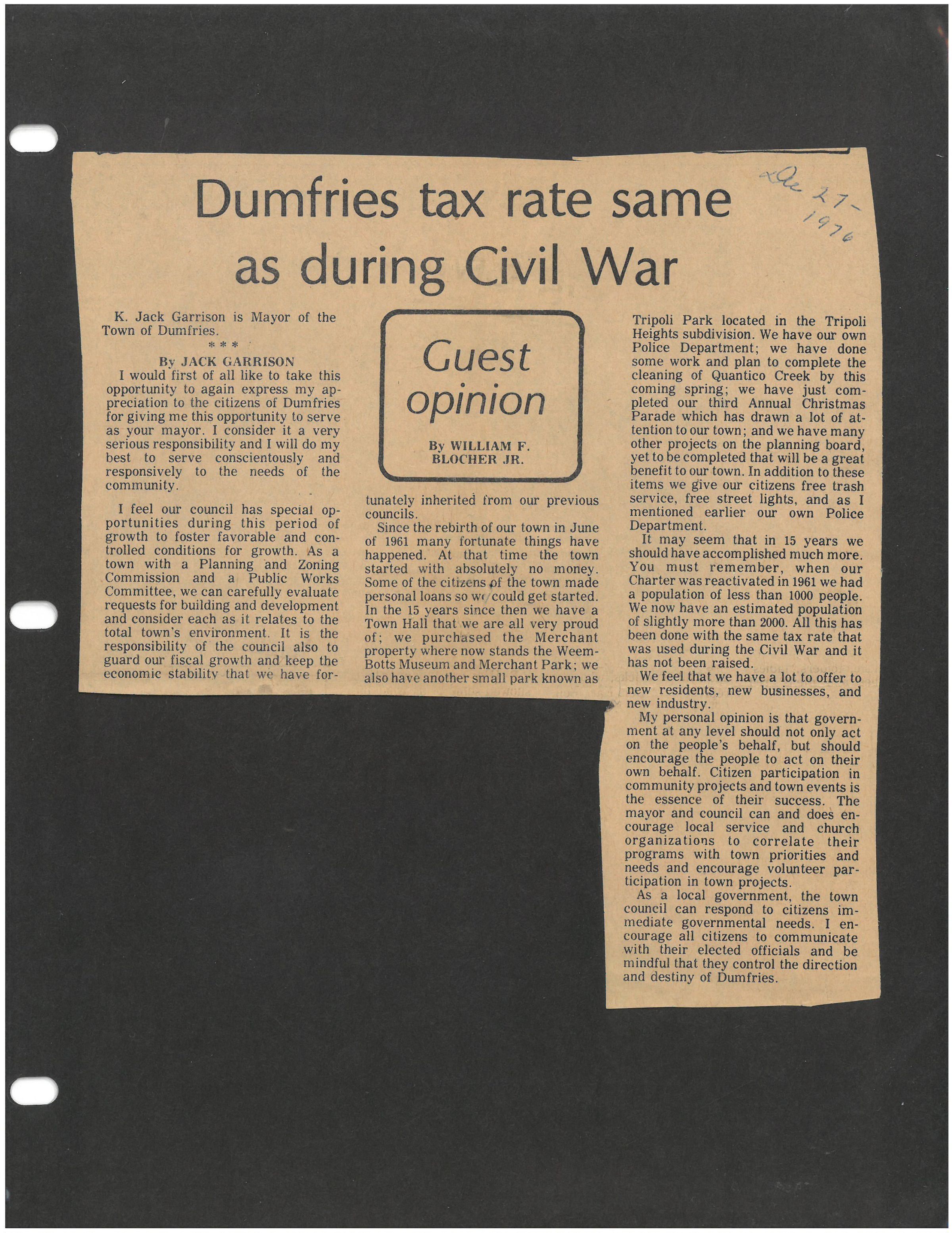 Since the rebirth of our town in June of 1961 many fortunate things have happened. At that time the town started with absolutely no money. Some of the citizens of the town made personal loans so we could get started. In the 15 years since then we have had a Town Hall that we are all very proud of; we purchased the Merchant Property where now stands the Weems-Botts Museum and Merchant Park; We also have another small park known as Tripoli Park located in the Tripoli Heights subdivision. We have our own Police Department; we have done some work and plan to complete the cleaning of Quantico Creek by this coming spring; we have just completed our third annual Christmas Parade which has drawn a lot of attention to the town, and we have many other projects on the planning board, yet to be completed that will be a great benefit to our town. In addition to these items we give our citizens free trash service, free street lights, and as I mentioned earlier our own Police Department.
