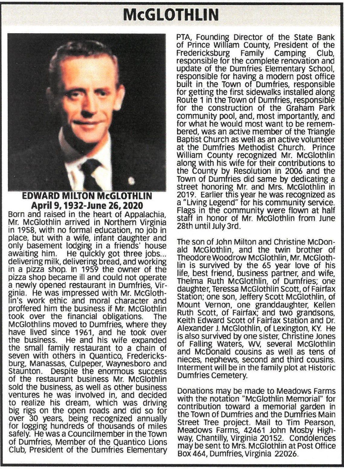 Born and raised in the heart of Appalachia, Mr. McGlothlin arrived in Northern Virginia in 1958, with no formal education, no job in place, but with a wife, infant daughter and only basement lodging in a friends' house awaiting him. He quickly got three jobs...delivering milk, delivering bread, and working in a pizza shop. In 1959 the owner of the pizza shop became ill and could not operate a newly opened restaurant in Dumfries, Virginia. He was impressed with Mr. McGlothlin's work ethic and moral character and proffered him the business if Mr. McGlothlin took over the financial obligations. The McGlothlins moved to Dumfries, where they have lived since 1961, and he took over the business. He and his wife expanded the small family restaurant to a chain of seven with others in Quantico, Fredericksburg, Manassas, Culpeper, Waynesboro and Staunton. Despite the enormous success of the restaurant business Mr. McGlothlin sold the business, as well as other business ventures he was involved in, and decided to realize his dream, which was driving big rigs on the open roads and did so for 30 years, being recognized annually for logging hundreds of thousands of miles safely. He was a Councilmember in the Town of Dumfries, Member of the Quantico Lions Club, President of the Dumfries Elementary PTA, Founding Director of the State Bank of Prince William County, President of the Fredericksburg Family Camping Club, responsible for the complete renovation and update of the Dumfries Elementary School, responsible for having a modern post office built in the town of Dumfries, responsible for getting the first sidewalks installed along Route 1 in the Town of Dumfries, responsible for the construction of the Graham Park community pool, and, most importantly, and for what he would most want to be remembered, was an active member of the Triangle Baptist Church as well as active volunteer at theat the Dumfries Methodist Church. Prince William County recognized Mr. McGlothlin along with his wife for their contributions to the County by Resolution in 2006 and the Town of Dumfriesdi same by dedicating a street honoring Mr. and Mrs. McGlothlin in 2019. Earlier this yearhe was recognized as a "Living Legend" for his community service. Flags in the community were flown at half staff in honor of Mr. McGlothlin from June 28th until July 3rd.