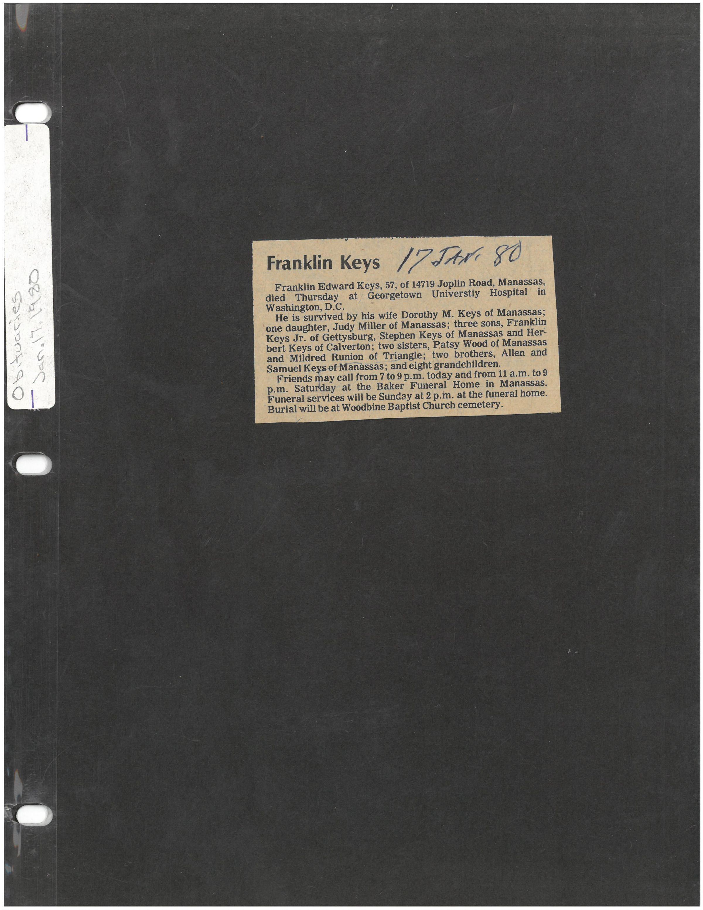 He is survived by his wife Dorothy M. Keys of Manassas;