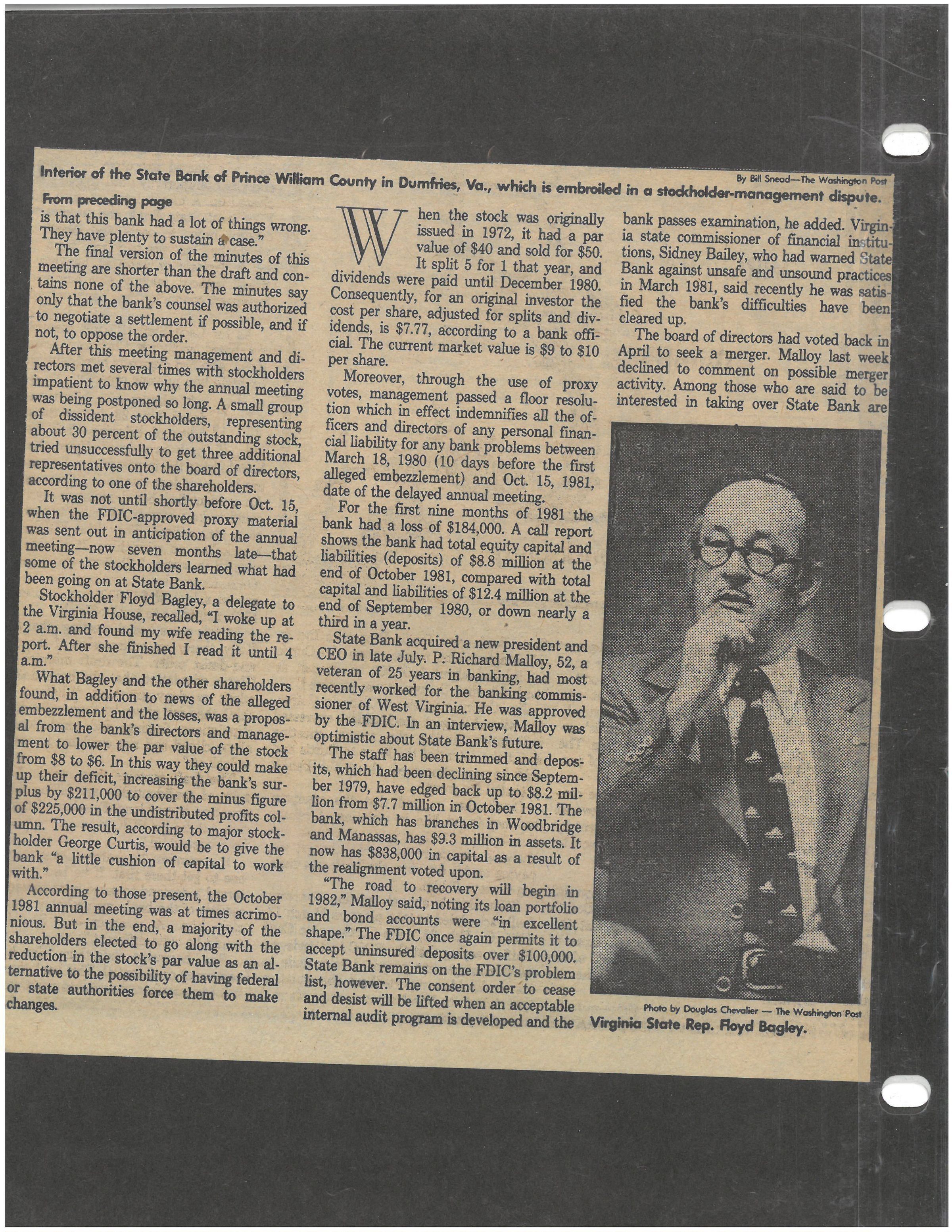 State Bank acquired a new president and CEO in late July. P. Richard Malloy, 52, a veteran of 25 years in banking, had most recently worked for the banking commisioner of West Virginia. He was approved by the FDIC. In an interview, Malloy was optimistic about State Bank's future.