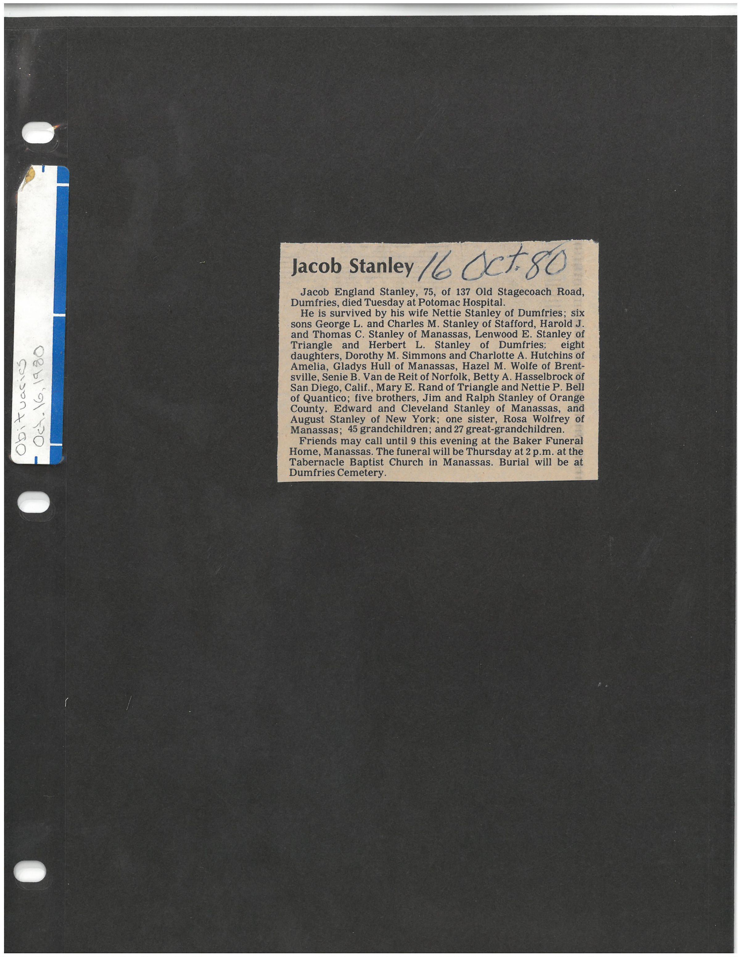 He is survived by his wife Nettie Stanley of Dumfries; six