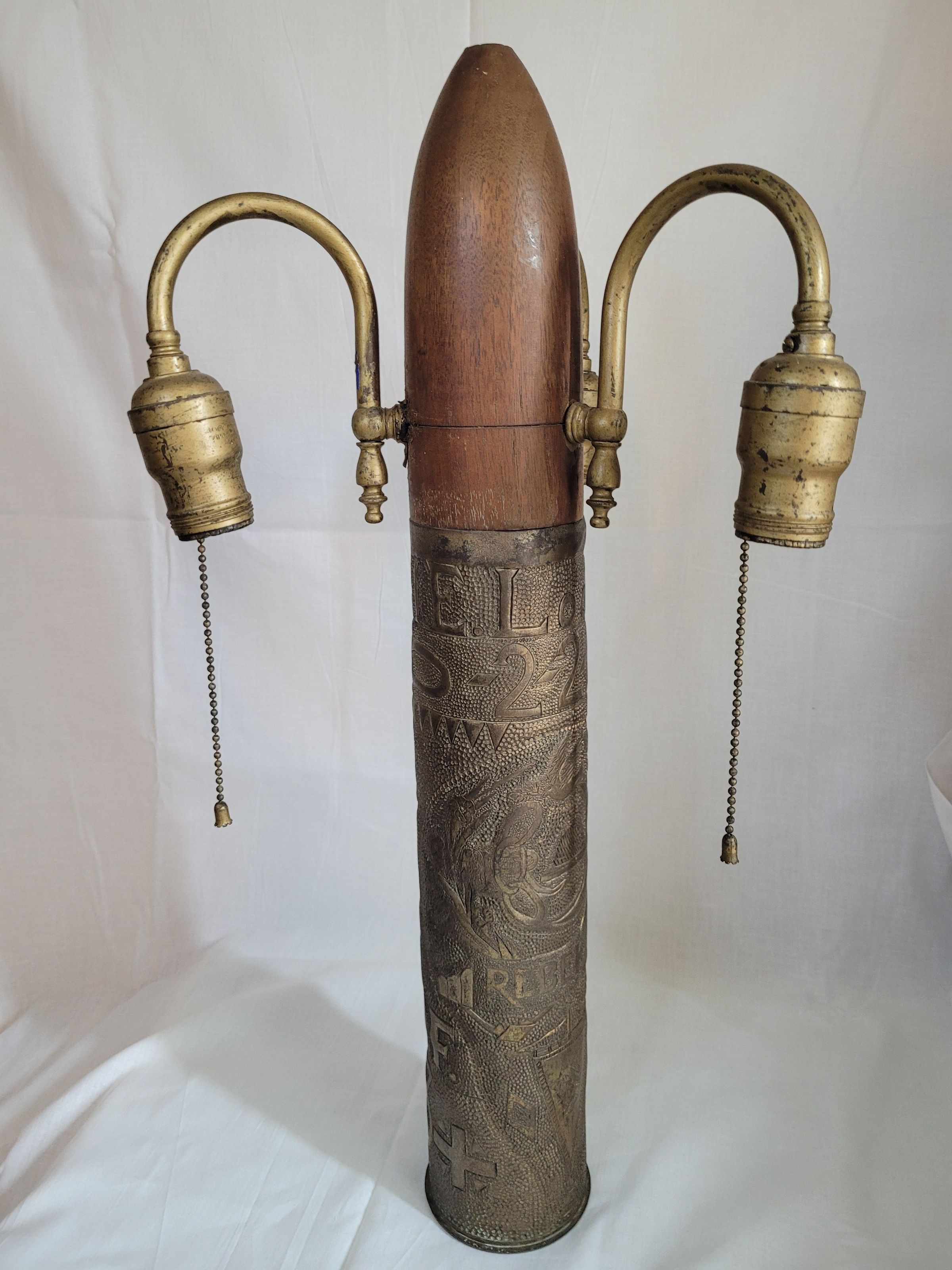Lamp made from a shell casing. Once in the Robert E. Lee Lodge Hall of the Independent Order of Odd Fellows in Dumfries, VA. Casing has been engraved with a variety of pictures, symbols and wards.Use