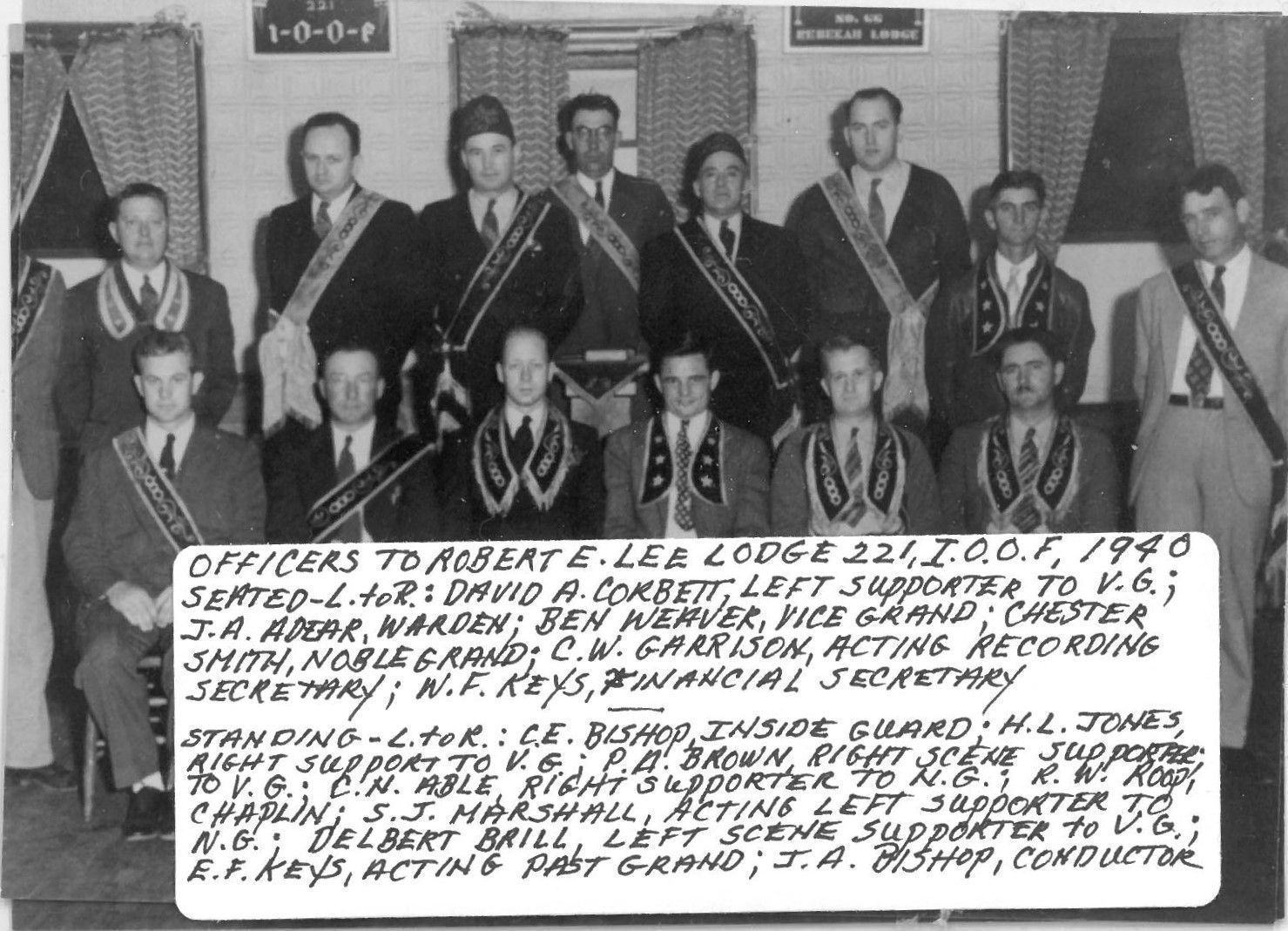 Standing - L. to R.: C.E. Bishop, Inside Guard; H.L Jones, Right Support to V.G.; P.A. Brown, Right Scene Supporter to V.G.; C.N. Able, Right Supporter to N.G.;R.W. Roop, Chaplin; S.J. Marshall, Acting Left Supporter to N.G.; Delbert Brill, Left Scene Supporter to V.G.; E.F. Keys, Acting Past Grand; J.A. Bishop, Conductor