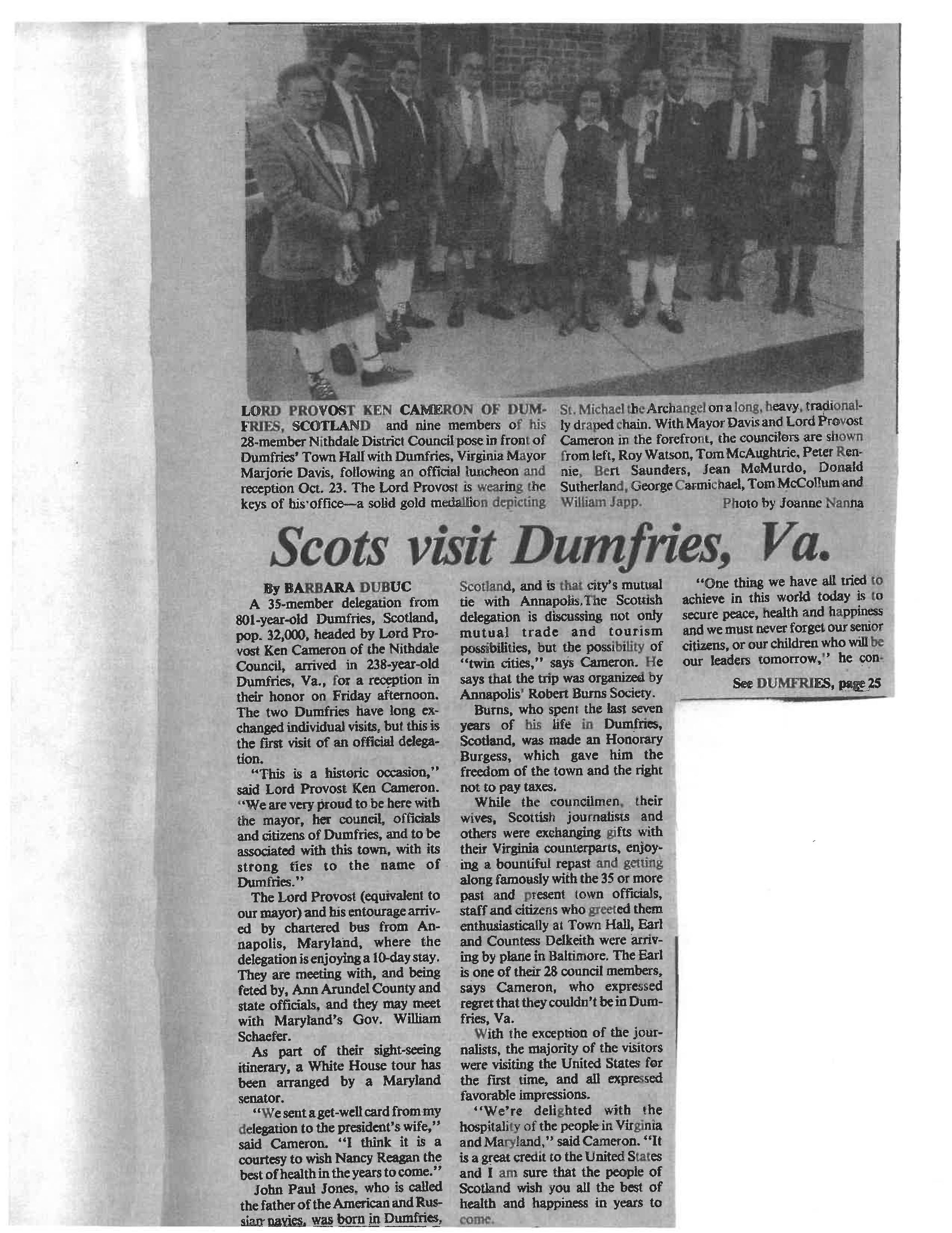 A 35-member delegation from 801-year-old Dumfries, Scotland, pop. 32,000, headed by Lord Provost Ken Cameron of the Nithdale council, arrived in 238-year-old Dumfries, Va., for a reception in their honor on Friday afternoon. The two Dumfries have long exchanged individual visits, but this is the first visit of an official delegation.