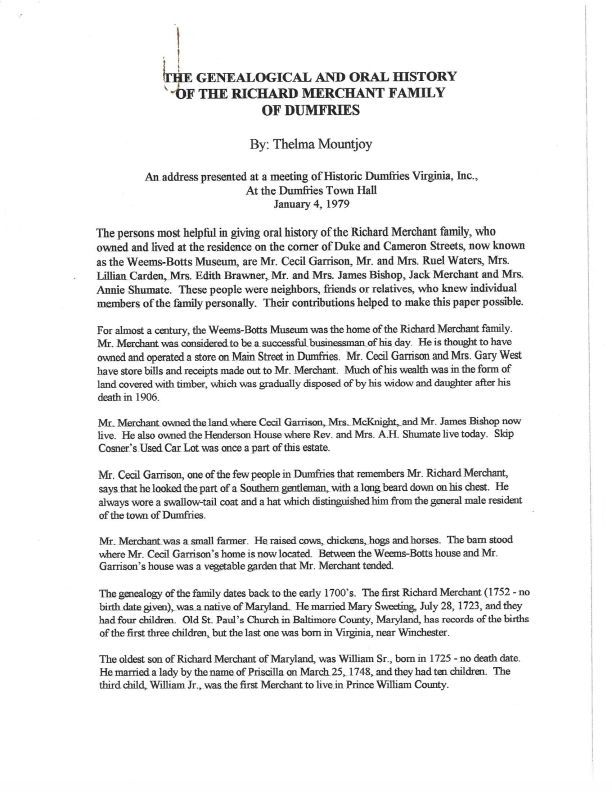 The persons most helpful in giving oral history of the Richard Merchant family, who owned and lived at the residence on the corner of Duke and Caeron Streets, now known as the Weems-Botts Museum, are Mr. Cecil Garrison, Mr. and Mrs. Ruel Waters, Mrs. Annie Shumate. These people were neighbors, friends or relatives, who knew individual members of the family personally. Their contributions helped to make this paper possible.