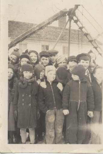 Children by slide at the Aux Sable School on Cemetery Rd. c1935