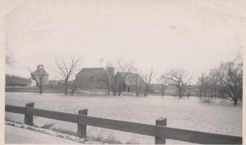 Du Page River at flood stage, looking north-west from bridge on Channahon-Minooka Blacktop Eneix Farm undated