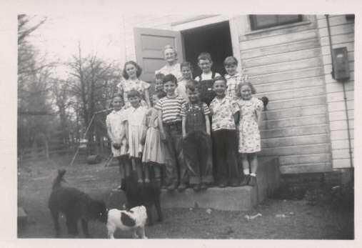 Children & dogs at the Aux Sable School c1950 Jo Rene Ehrmann, S. Kinsella, Blankenship, F. Belle Berneice Rose, Fred Swigget, Turner Hansen, Don Momper, Ruth Boardman E. Blankenship M. Kinkin, B Friddle