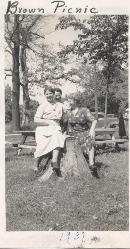 3 women sitting on a tree stump at Lutzow's Grove for the Brown School Picnic 1937