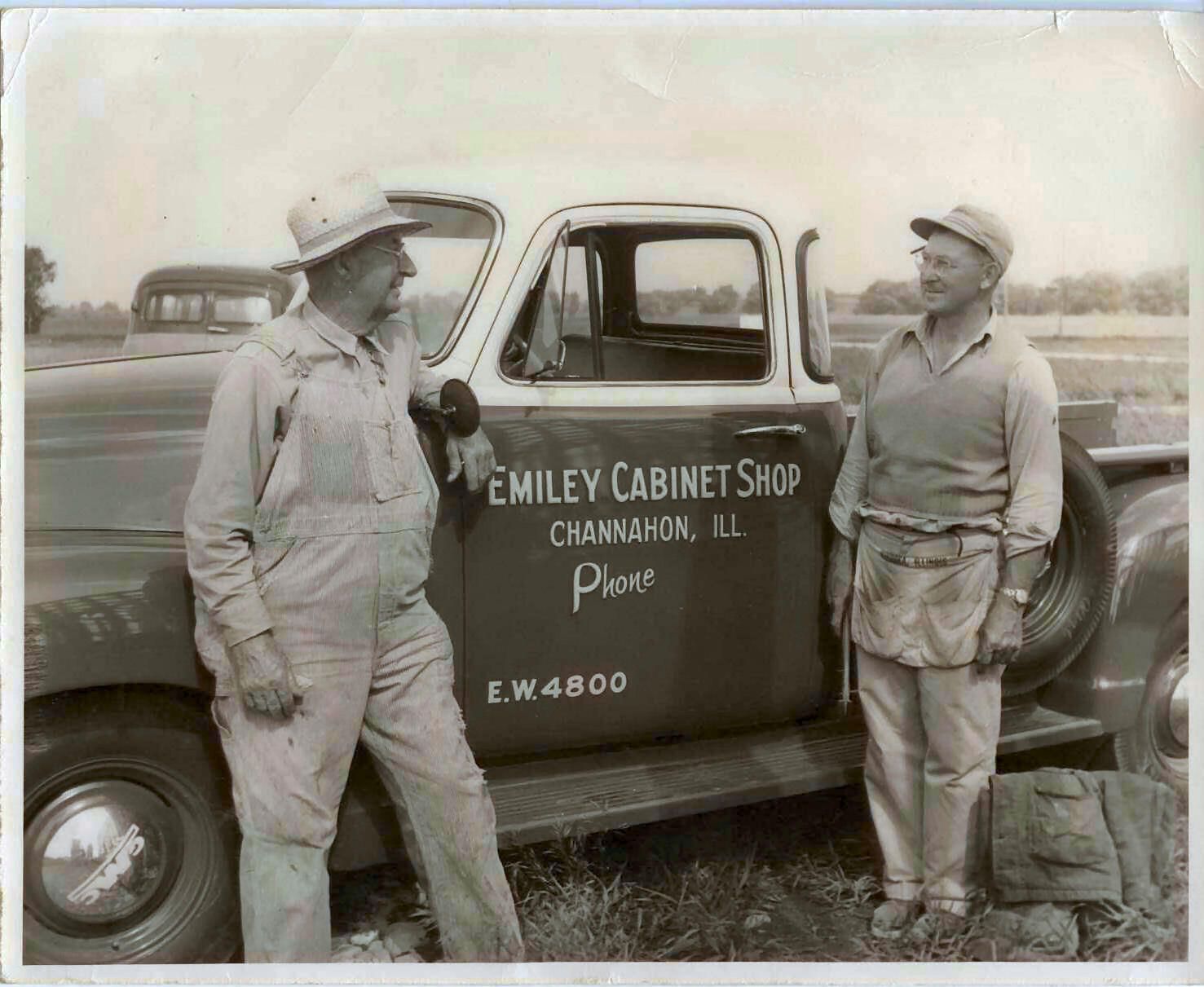 Two men standing by truck that says Emiley Cabinet Shop, Channahon IL Phone E.W. 4800 on back c1955 Sunshine Manor 1/2 ton GMC Pickup bought in Rollo, Mo. (Don't know if photo or truck was bought in Rollo, Mo)