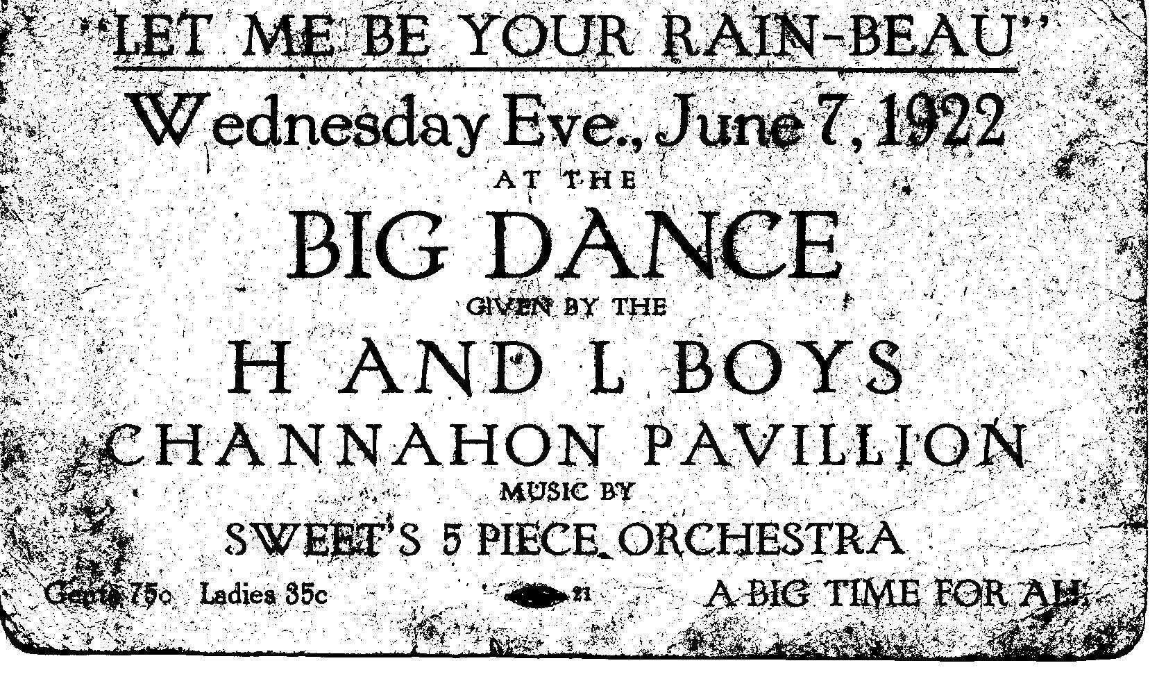Wednesday Evening, June 7, 1922 a the Big Dance given by the H and L Boys, Channahon Pavillion, Music by Sweet's 5 Piece Orchestra