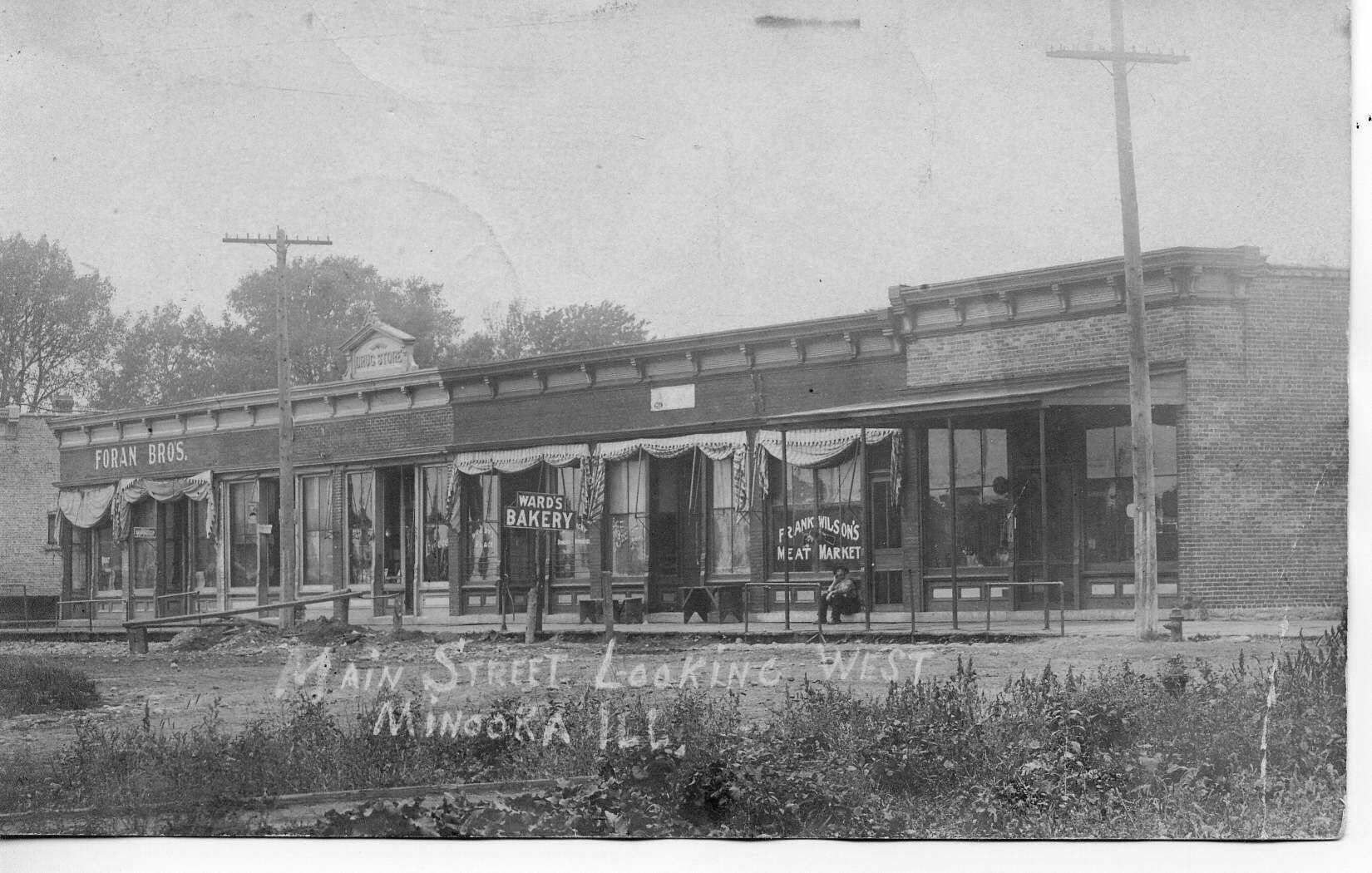 Show's Foran Bros. Store, Watson's Drug Store, Ward's Bakery, Frank Wilson's Meat Market
