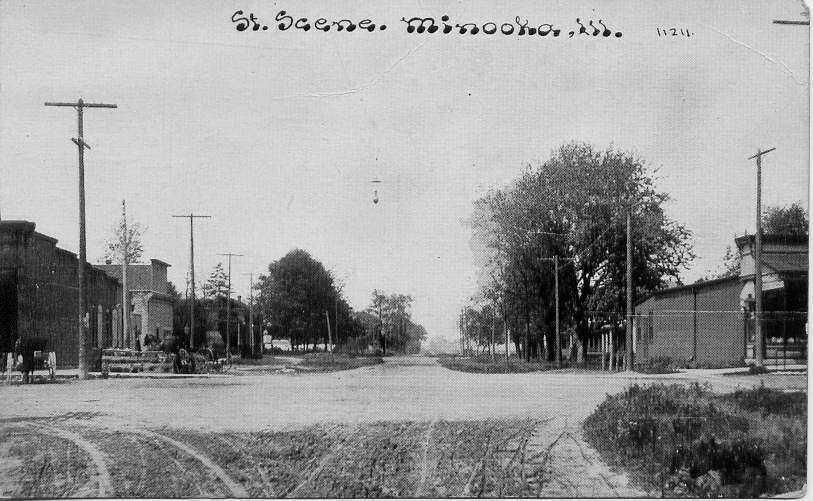 Looking North on Wabena Ave. from Mondamin St. c1907 To Inez Holt from Lulu Happy New Year Inez, Here is a Minooka card for your book, lovingly, Lulu