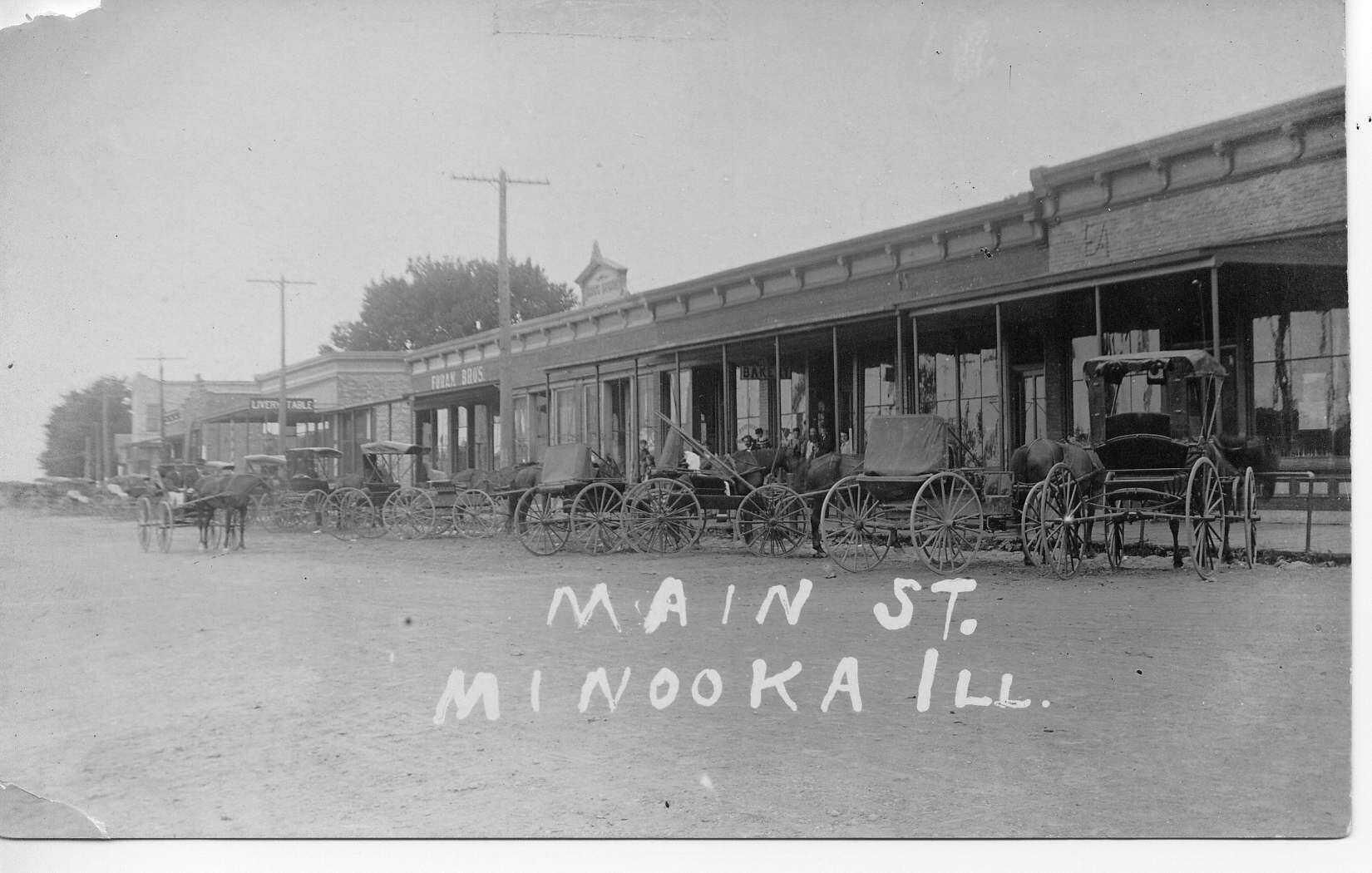 Looking west on Mondamin from Wabena, buggies lined up along street. Foran Bros, Watson's Drug Store, Livery Stable, Bakery