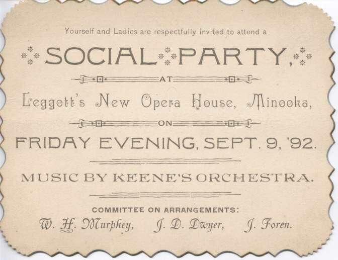 Yourself and Ladies are respectfully invited to attend a Social Party at Leggott's New Opera House, Minooka