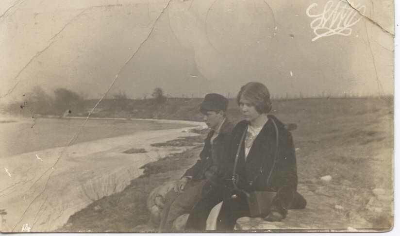 2 People sitting on bank of river Postcard sent to Miss Ada Knowlton, Minooka, ILL March 1913 "Sample Print" William & Ada near DuPage River south of Channahon taken by Lorrie or Louie