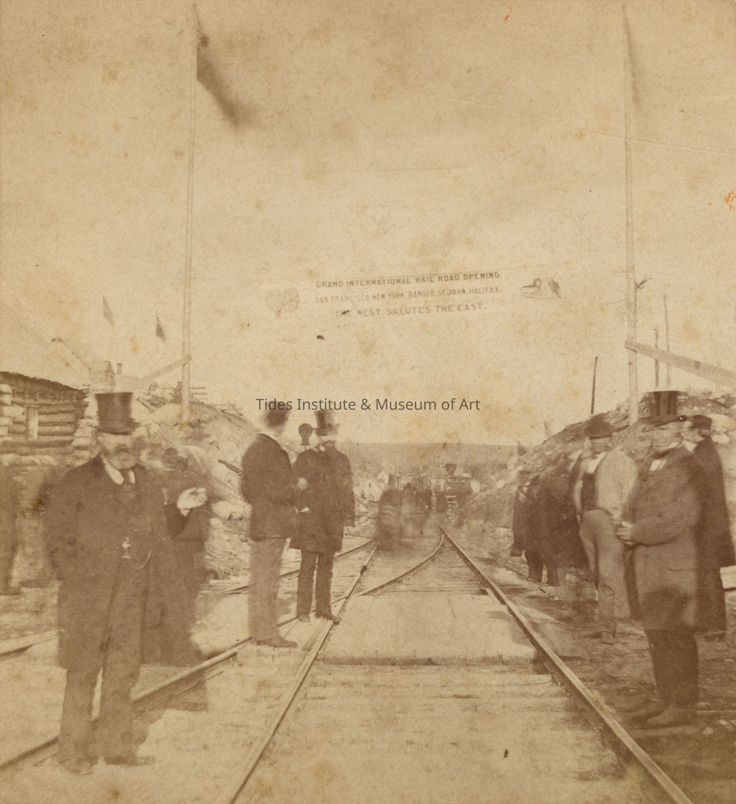 OPENING OF THE EUROPEAN & NORTH AMERICAN RAILWAY, VANCEBORO, MAINE, 1871! Rare stereoview photo that just came into our collections that shows the significant ceremony held on October 19, 1871 at the northern Washington County border community of Vanceboro, Maine for the opening of the European and North American Railway. U.S. President Ulysses S. Grant, along with other U.S. and Canadian dignitaries, attended the event which marked the completion of the railway line connecting Bangor, Maine, to Saint John, New Brunswick. The ceremony included a luncheon, speeches, and a symbolic "last spike" moment at the border crossing between Maine and New Brunswick. Banner in the photo reads: Grand International Rail Road Opening, San Francisco, New York, Bangor, St. John, Halifax, The West Salutes the East. Photo was taken by A.K. Dole and published by C.L. Marston of Bangor, Maine.