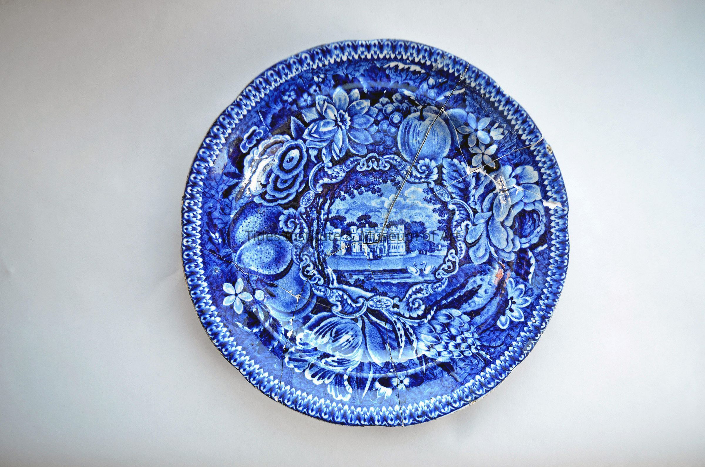 An early 19th century flow blue English stone china dish that was pieced back together from a number of shards. On the back of the dish is stamped: R. Hall's, Select Views, Warleigh House, Somersetshire, Stone China. The 8 1/2 inch wide dish was made in England and dates to about 1825. This dish was unearthed in 2018 during the excavation of a six foot deep 19th century household “dump” in this region that was filled with thousands upon thousands of beautiful, but broken early 19th century ceramic and glass shards. The “dump” was on the site of a large house built in 1824 and torn down in the early 1960s. The house underwent considerable renovation in the mid-19th century. During this renovation, the existing house pantry full of ceramic and glass ware was likely cleared out and thrown in the “dump.” Some ceramic and glass shards came into the institute’s collections during this initial excavation, but much was also taken out of the region to Portland, Maine and to North Dakota. The institute sought the return of what was removed from the area. All that went to the Portland area is now back in the institute’s collections. Nearly all (including this piece), with the exception of two pieces, that went to North Dakota is now back in the institute’s collections. In the summer of 2020, another excavation of the same household “dump” was undertaken and several hundred more ceramic and glass shards were found, some of which perfectly matched shards unearthed two years before. About 100 ceramic and glass pieces have been put back together, either entirely or nearly entirely.
