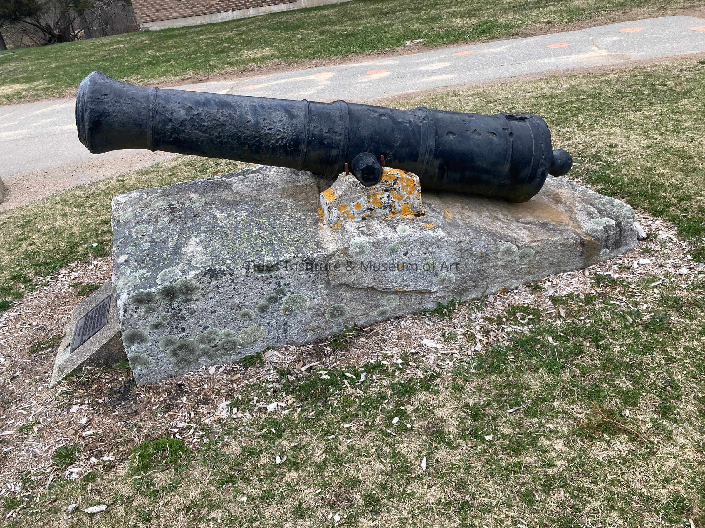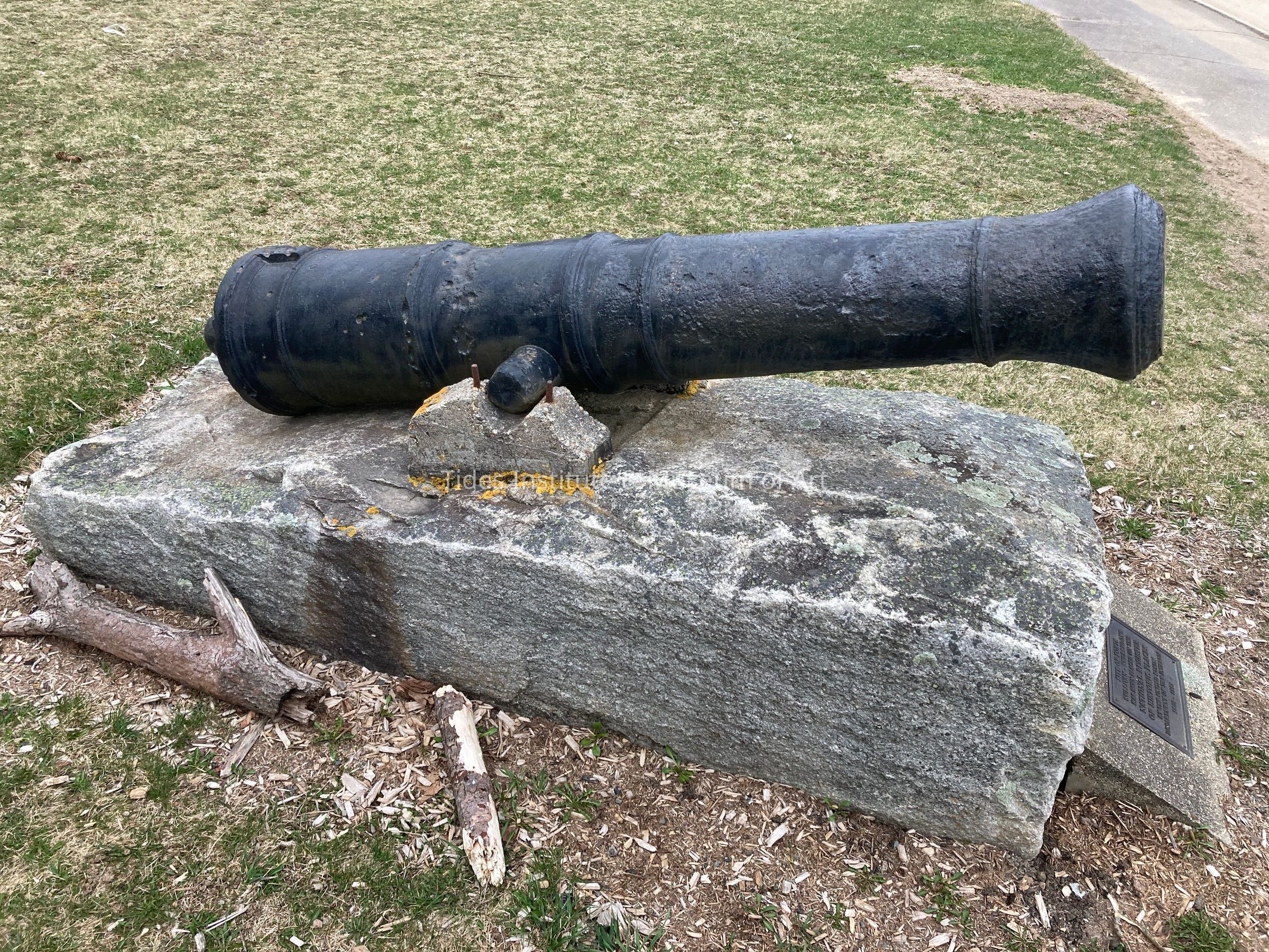 The British Naval cannon was taken off the wrecked British mast ship “Britannia” but it was not a “British Naval cannon”. It was cast by the British East India Co. for its ships in the East India trade. At times this company made cannons for the British Navy. The “crown” near the end of the cannon (on top) is the mark of the British East India Co. not the regular mark “crown” of British military equipment made for the British military. This information was researched by Bob Dallison of Fredericton, New Brunswick, retired Lieut. Col. Canadian Army, law degree in history, a noted New Brunswick historian. He was puzzled by the “crown” on this cannon because as he said it's not the British quartermaster's mark that's on military equipment. One of his friends researched the “crown” and discovered it was from the British East India Co.