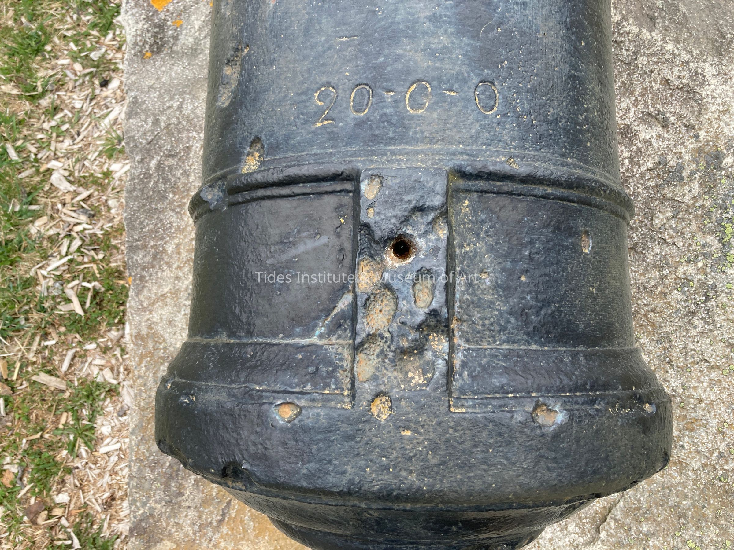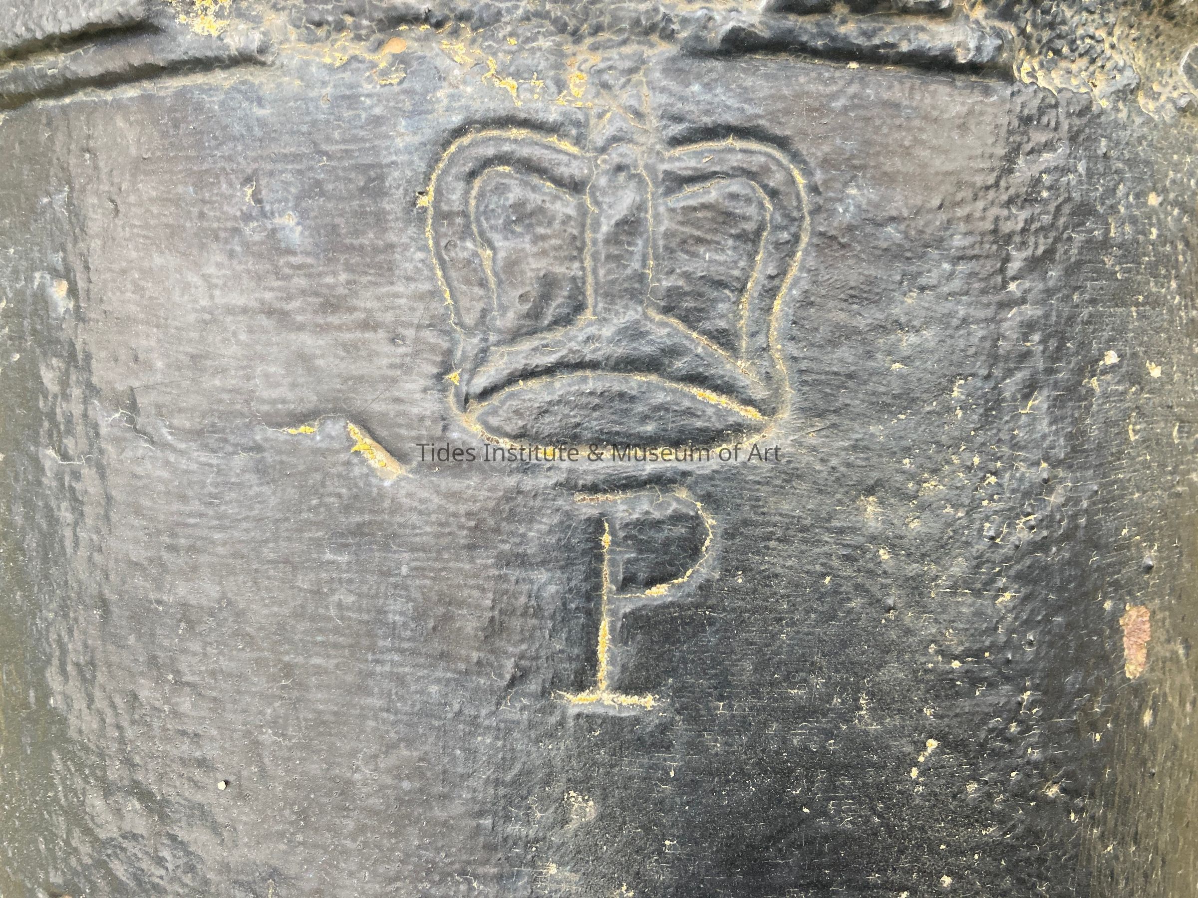 The Crown over a “P” engraved on top of the guns is a mark used to show that this gun was proofed at Woolwich in the UK. This mark is usually preserved for the guns for foreign governments, or for certain institutions such as The East India Company, or the Post Office. This gun was probably cast some time in the second quarter of the 19th century. By this period there are not many British companies capable of casting these guns, they are usually either Walker and Company, Bailey Pegg and Co, or Low Moor. (Ruth Rhynas Brown)