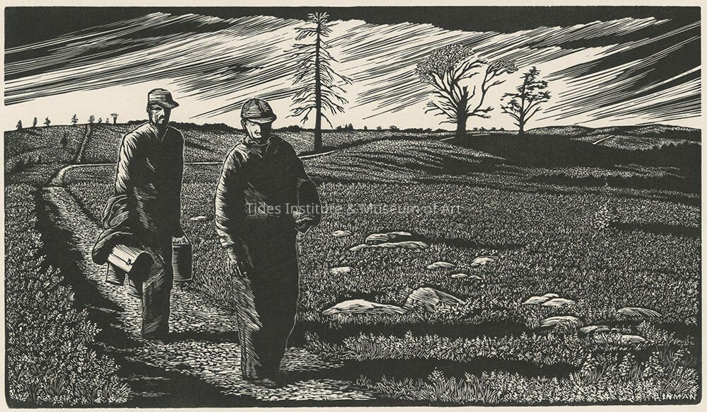 Two blueberry rakers, eyes downcast, carry their lunch boxes across the dirt path as they either arrive at dawn to begin their work or head home in the evening after an exhausting workday. Inman’s use of shadows evokes the warm atmosphere of an August day. The sun, low in the horizon and coming from the left side of the composition, throws dramatic columns of shadows attached to the workers’ feet, pricked by the low blueberry bushes; the shadows cast by the clouds in the sky give rolling contours to the barrens. Inman employed contrasting mark making in the tiny leaves of the craggy blueberry bushes and the long streaks of clouds reflecting the sun low in the sky. The resulting distinction between foreground and background, reproduces the expansive feeling of blueberry barrens: open to the elements and seemingly never ending.