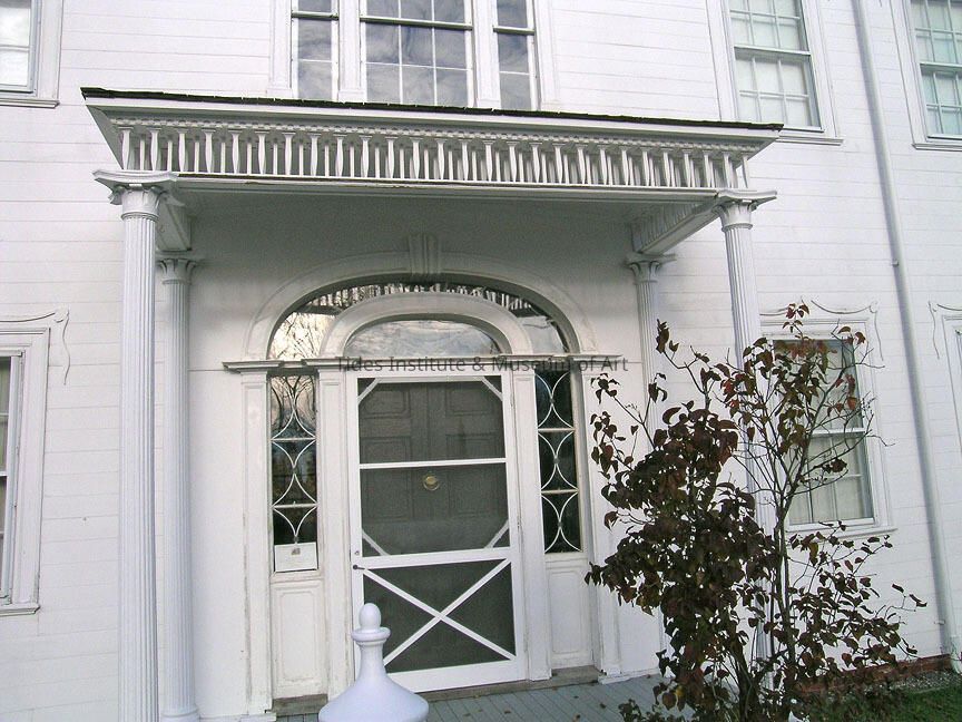 Thomas Ruggles came to Columbia Falls in 1770 from Rochester, Massachusetts, and eventually became the largest owner of timberland in the area. He also owned a saw mill, was the postmaster, general store keeper, shipbuilder and Chief Justice of the Court of Sessions at Machias. Judge Ruggles brought Aaron Sherman and Alva Peterson from Duxbury, Massachusetts to build his house for him; Mr. Sherman was the master builder. There are two theories as to who was responsible for the elaborate woodwork, one being that Judge Ruggles hired a fine wood carver from England, and the other more feasible explanation that Alva Peterson, a master craftsman and ship carpenter, completed the intricate molding and woodwork on the interior and exterior of the house. This Federal style home is only one room deep. It was completed in 1820, and originally had an ell on the back of the house which was removed in 1938 due to its poor condition. Judge Ruggles died soon after the completion of his residence. The house is know for its flying staircase and the fine wood carving, and has a semielliptical fanlight crowning the doorway. The Ruggles House is on the National Register of Historic Places, and is open to the public as a museum. The Ruggles House Society of Bar Harbor was formed in 1949 to restore the house and open it to public display. It is open all summer. DH, AFN, JCB