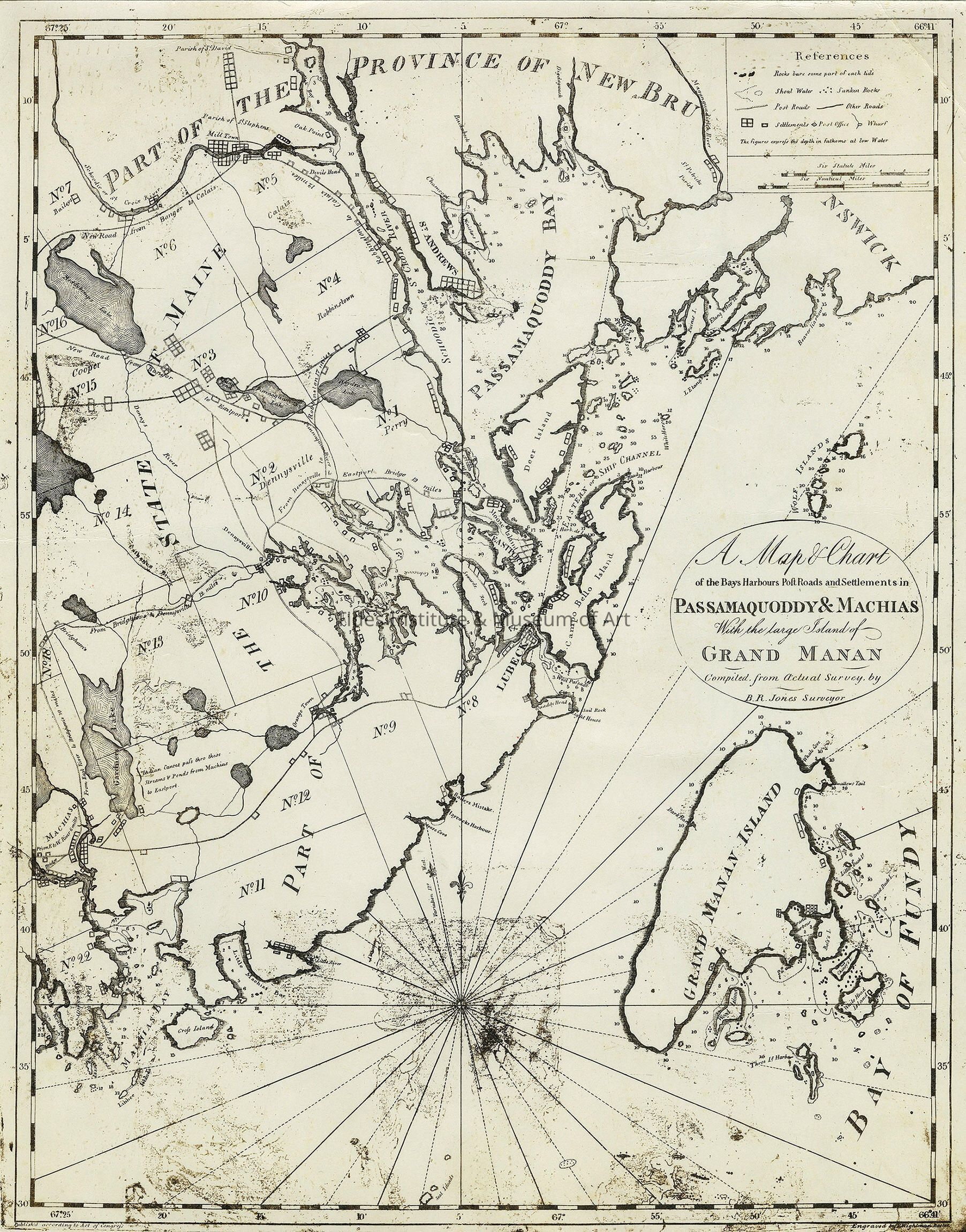 A Map & Chart of the Bays Harbours Poft Roads and Settlements in Passamaquoddy & Machias With the large Island of Grand Manan | B.R. Jones