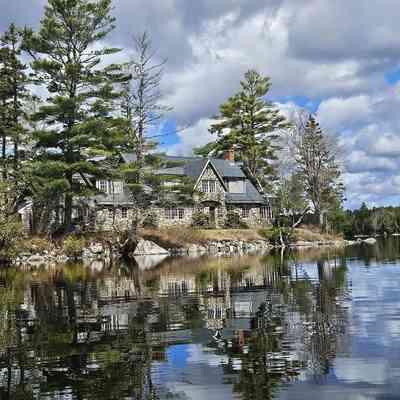 Located on a small man-made island on the west shore of Bog Lake is this stately summer cottage, built around 1915 for Mr. Frenning of Belmont, Massachusetts. The house is constructed of local field stone, and the stone work was done by Alan Morse and other workmen, and the carpentry by Lindell Corporation. The building has a large field stone fireplace, slate roofing, a gabled roof with many cross-gables. The house had its own electric power source until the 1950s. AFN
