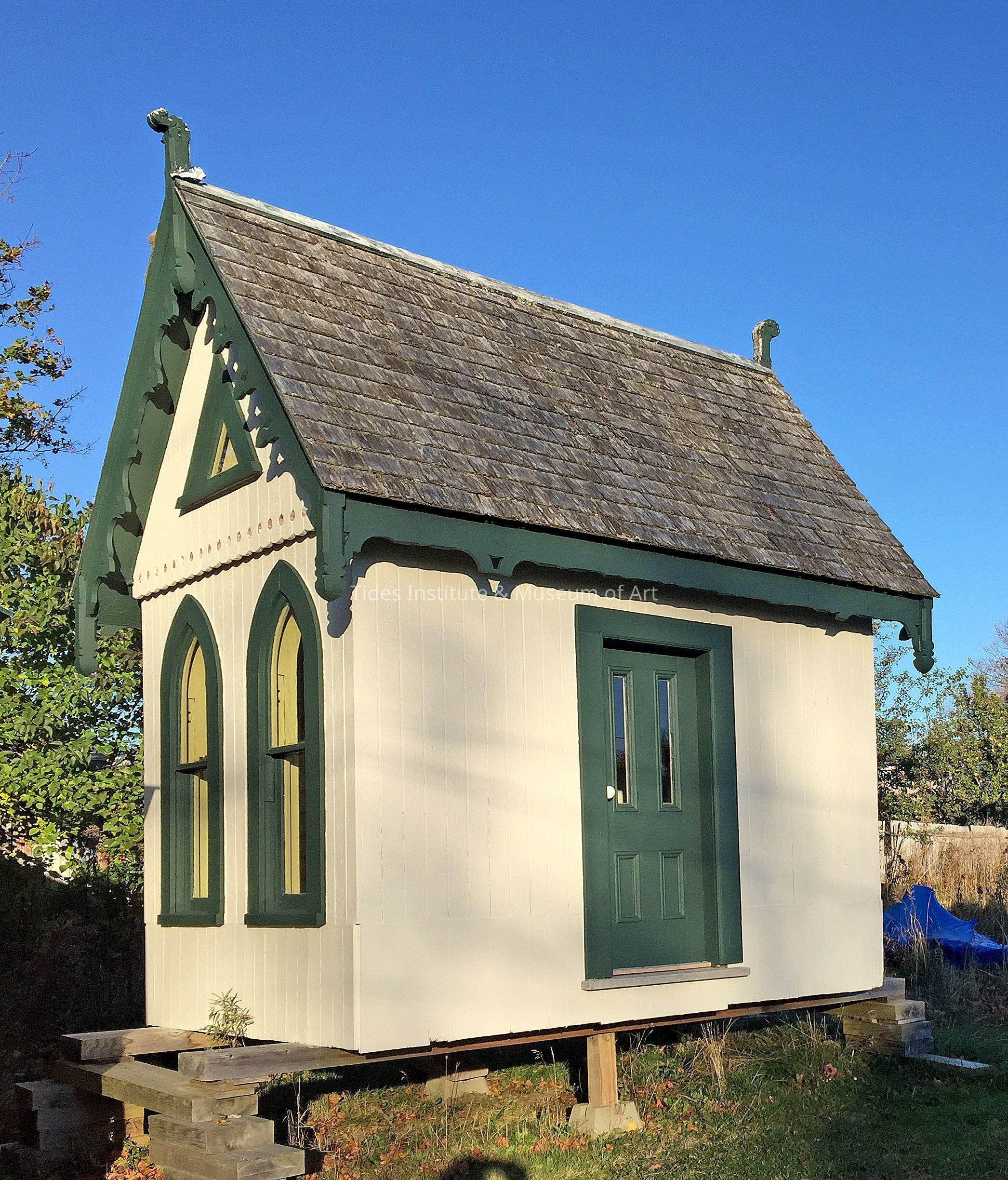 A late 19th century full size victorian style child’s playhouse owned by the Tides Institute & Museum of Art. It is one of eight historic buildings owned by the Tides Institute that date from 1819 to the 1890s and that help preserve and illustrate the architectural legacy of this region. The playhouse was originally built for a then mayor, Edward S. Waide, of Eastport, Maine as a gift to his daughter, Dorothy Waide, who was born in 1894. She spent much of her later life living in her parents home until she died in 1974. The playhouse is approximately 12 feet high, nine feet long and six feet wide. For many years the playhouse stood on the lawn surrounding the mayor’s large historic home in the center of Eastport. In the early 1940s, the playhouse was removed to be next to a house at the outskirts of Eastport. The playhouse was gifted to the Tides Institute in 2017 by Sheila and Ronald Sullivan and family. Sheila grew up and lived at the house on the grounds where the playhouse had been moved to in early 1940s by her father, Leslie Grant (1907-1971). She played in the house as a young child as did her children and grandchildren. Her husband Ronald’s grandfather built the playhouse in the late nineteenth century for the then mayor of Eastport with help from his son, Ronald’s father. The Tides Institute is now restoring the playhouse and had the interior and exterior of the house repainted this past summer. Missing pieces of exterior decorative woodwork trim still need to be replicated and the roof still needs to be reshingled with wood shingles. The Tides Institute is in the process of determining an appropriate long term location for the playhouse where, it is hoped, the playhouse can once again, on occasion at least, be used by children.