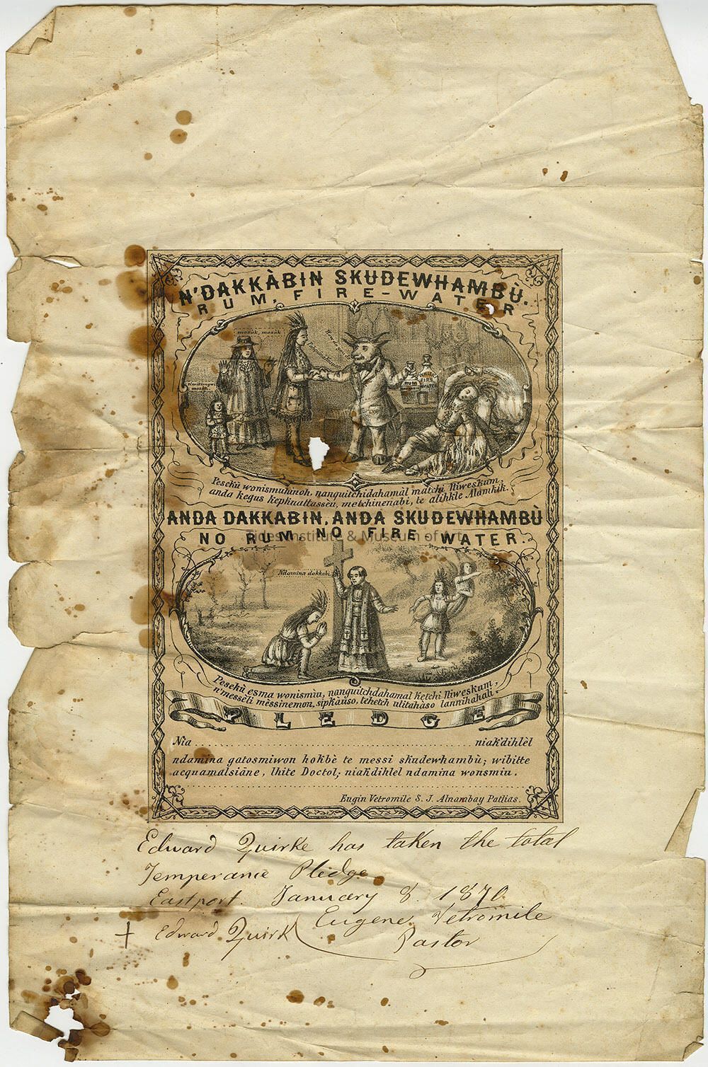 A large Passamaquoddy/English language temperance pledge broadside that dates to 1870. The pledge is signed by Edward Quick of Eastport, Maine and by Catholic Jesuit priest, Eugene Vetromile, who served the Catholic churches at both Eastport and the nearby Passamaquoddy community at Sipayik, Maine in the mid-19th century. During his time as a Jesuit priest, he wrote several books on Wabanaki history and worked on a Wabanakii language dictionary as well. The Tides Institute acquired the broadside from a descendant of the Quirk family who wanted to see the broadside preserved and accessible in an institution in the region where the broadside originatted. Thanks to Donald Soctomah, historic preservation officer for the Passamaquoddy Tribe, the broadside was recently translated by Robert Leavitt and Margarett Apt. Their line by line translation is as follows: